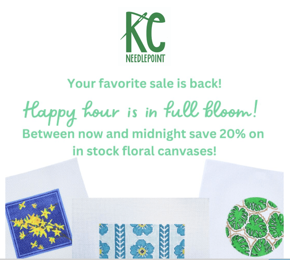 On a similar note KC Needlepoint each week on Friday has “Happy Hour”. From the time the email comes out until midnight they have a 20% off sale on the “Theme ” of the week. It was all floral canvases this past week. Keep an eye out, they may have something you were looking for !!! https://www.kcneedlepoint.com/?srsltid=AfmBOooHnUjALQL5AZLRnPXk_nieRR5gmlEgm2M9GrDygZuvqOGbrf4a