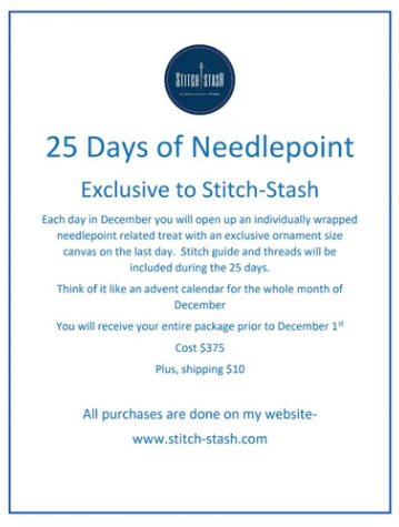 The second club is again from The Needlepointer. This time it’s a 9 month club that starts Feb/March and it’s called Holiday Greetings. The canvases are designed by Danji Designs and are envelopes for various holidays. You get a canvas on 18 count, stitch guide, thread pack AND a frame so you can self finish the projects. https://theneedlepointer.com/products/holiday-greetings?se_activity_id=168636449010&syclid=d4qbv34e8qus739dpqm0&utm_campaign=Join%20the%20Exciting%20Holiday%20Club%20Today!_168636449010&utm_medium=email&utm_source=shopify_email&selling_plan=6401327346&variant=48268015173874