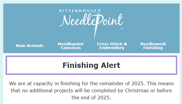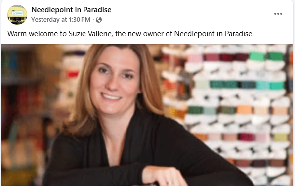 The very well known needlepoint shop in Dallas, Chaparral, has had a lot of issues !! The store is closed due to health issues by it’s owner Heidi. She was planning on moving her operation to Tennessee and becoming an online only store. She had a moving company pack up all her things along with the store – her entire inventory. Along the way the truck caught on fire – everything was lost !! At least no one got hurt. If you haven’t gotten a call from her then your finishing was still with the finishers. How devastating, she is starting all over again. We only wish her well and the best of luck.
