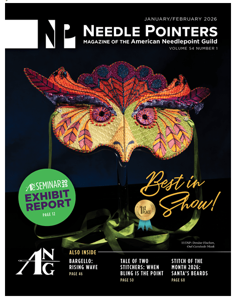 The new Needle Pointers magazine is about to hit your mailbox with the Nov/Dec 2025 issue. As usual it’s bright and colorful and packed with lots to read and admire. This issue in particular has a local needlepoint store to us in the “Shop Hop” article. They spotlighted “Ridgewood Needlepoint”. The Tale of 2 Stitchers canvas is amazing – I want to know how each did the bubbles !! LOL This magazine is a wonderful part of being a member of ANG. You can check it out online at the ANG web site if you can’t wait for the “snail”. While your at it – don’t forget to renew your membership. Earlier is always better and they now have options.
