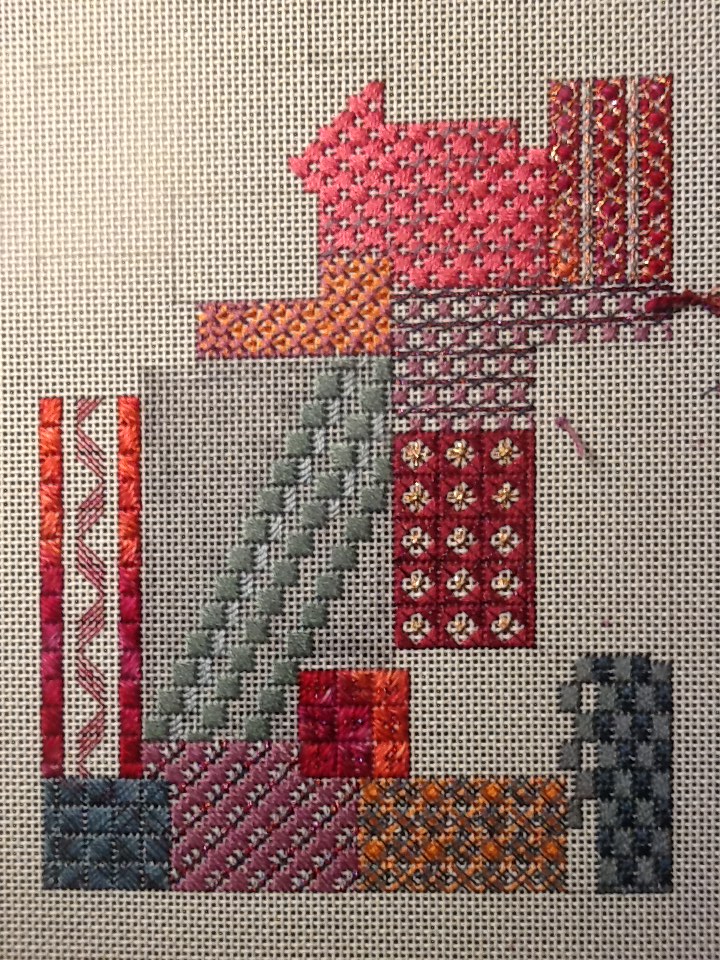 Today started early. I left my Room at 7:50 to go to my car four blocks away and pay cash for the next two days. I knew I would not be able to get lost in stitching until I had settled that. It started to rain as I ran back, but I figured it didn’t matter because the rest of the day was about being inside or in Andalucia. We covered seven new areas. I stitched on six of them and finished three. I have such respect for Joni Stevenson as I stitch this canvas. It is so well thought out. I love the subtlety of colors and stitches contrasted with hot colors and muted with layers of cool colors. This canvas I will work on once I return to NJ. I have learned so much from her. I might even check out her blog, which is a huge venture for me.