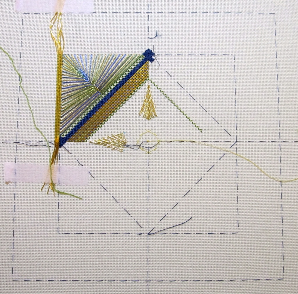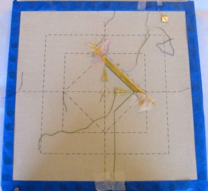 Day 2 began with plunging the gold threads to the back and wrapping them. What an experience! She gave us the option of using out $10 Japan needle or a plastic dental loop. I chose the dental loop as I was afraid the needle would fall off and I would lose it! It worked great to pull the gold to the back. The wrapping takes practice–I got pretty good and much faster with the ones I did tonight for homework! Then we needed to do 36 queen stitches so that we could be ready for the fan, or as she said “the fan” scaring us all. Then came laying the gold alongside the fan to be couched. Before we knew it four-thirty arrived and we had to be ready to do the next part tomorrow and most of us were not, hence homework.