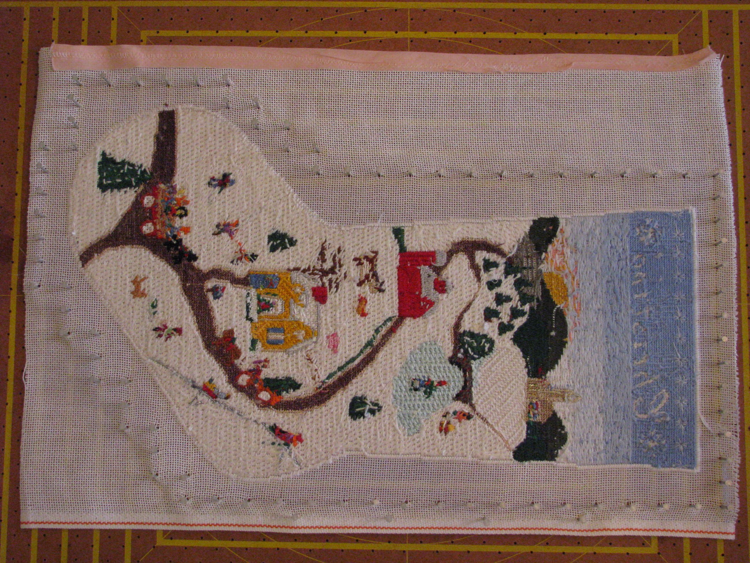 As you can see, it’s now on the blocking board (yes, I block right-side down!).  I’ve had to block it twice so far and it looks like it will need at least a 3rd round.  I don’t know if it’s because of the size or the canvas – it’s interwoven, not mono.  I’m hoping this  next round will finish it.  I haven’t blocked in a number of years so there’s also that!