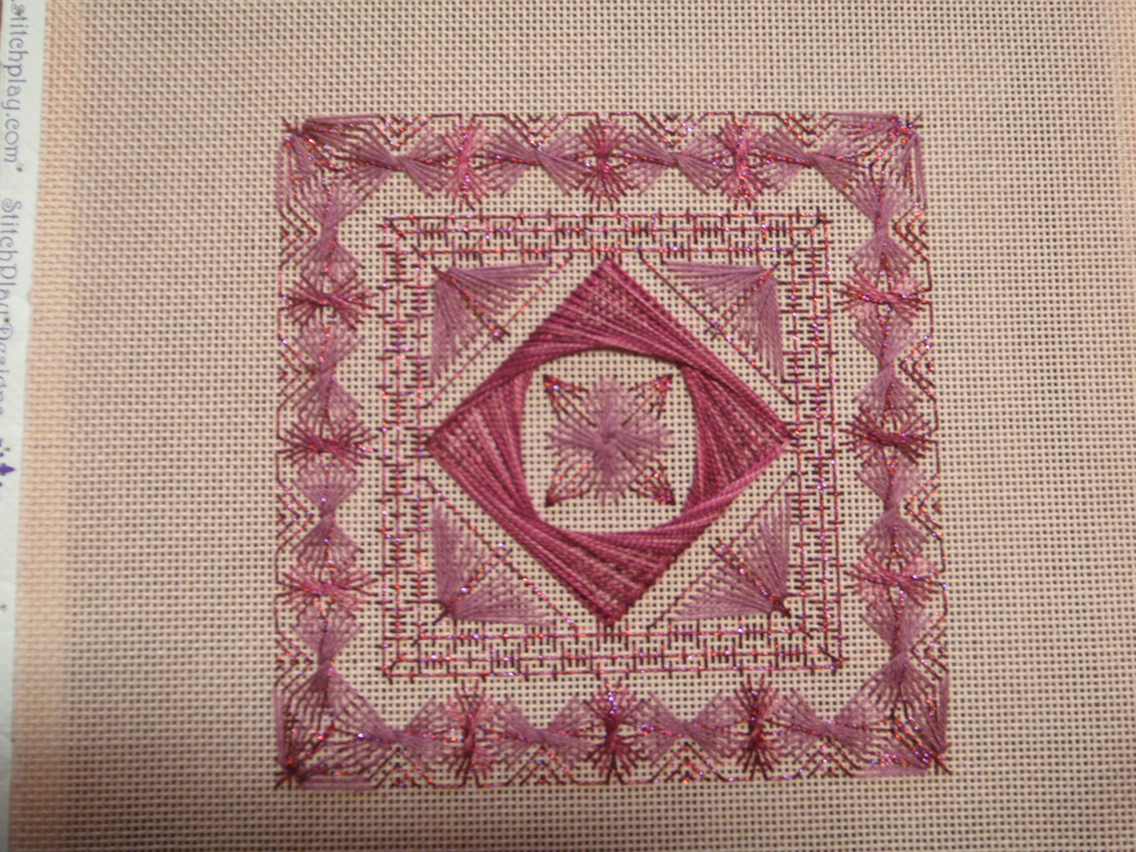 The stitches go pretty quickly and are fun to do. I do like the Cherries on pink canvas. I also finished the Wildflowers colorway on pink canvas — it is very soft and reminds me of the frosting on a wedding cake. Can’t figure out how to add a second picture so I’ll do another blog entry.