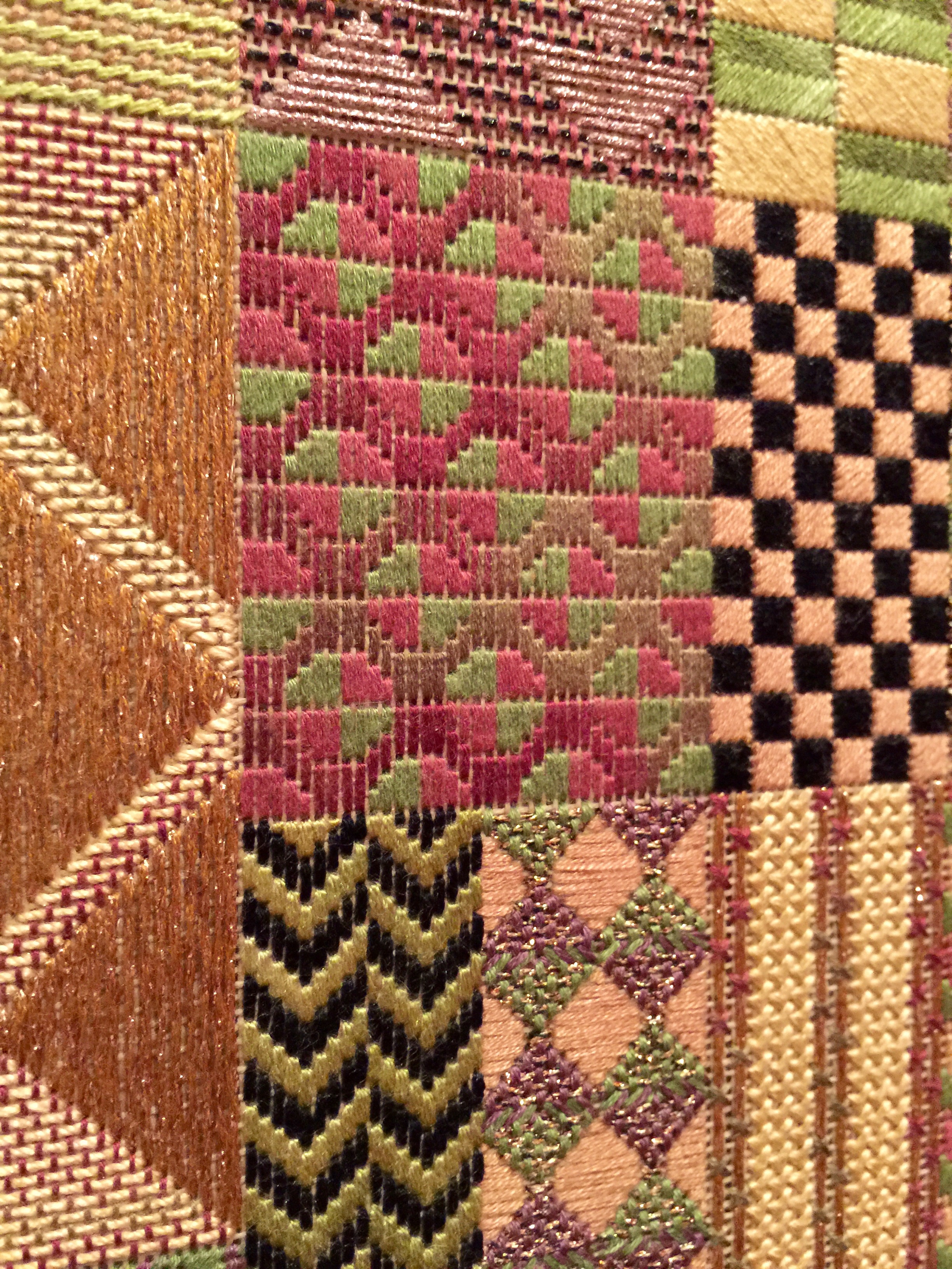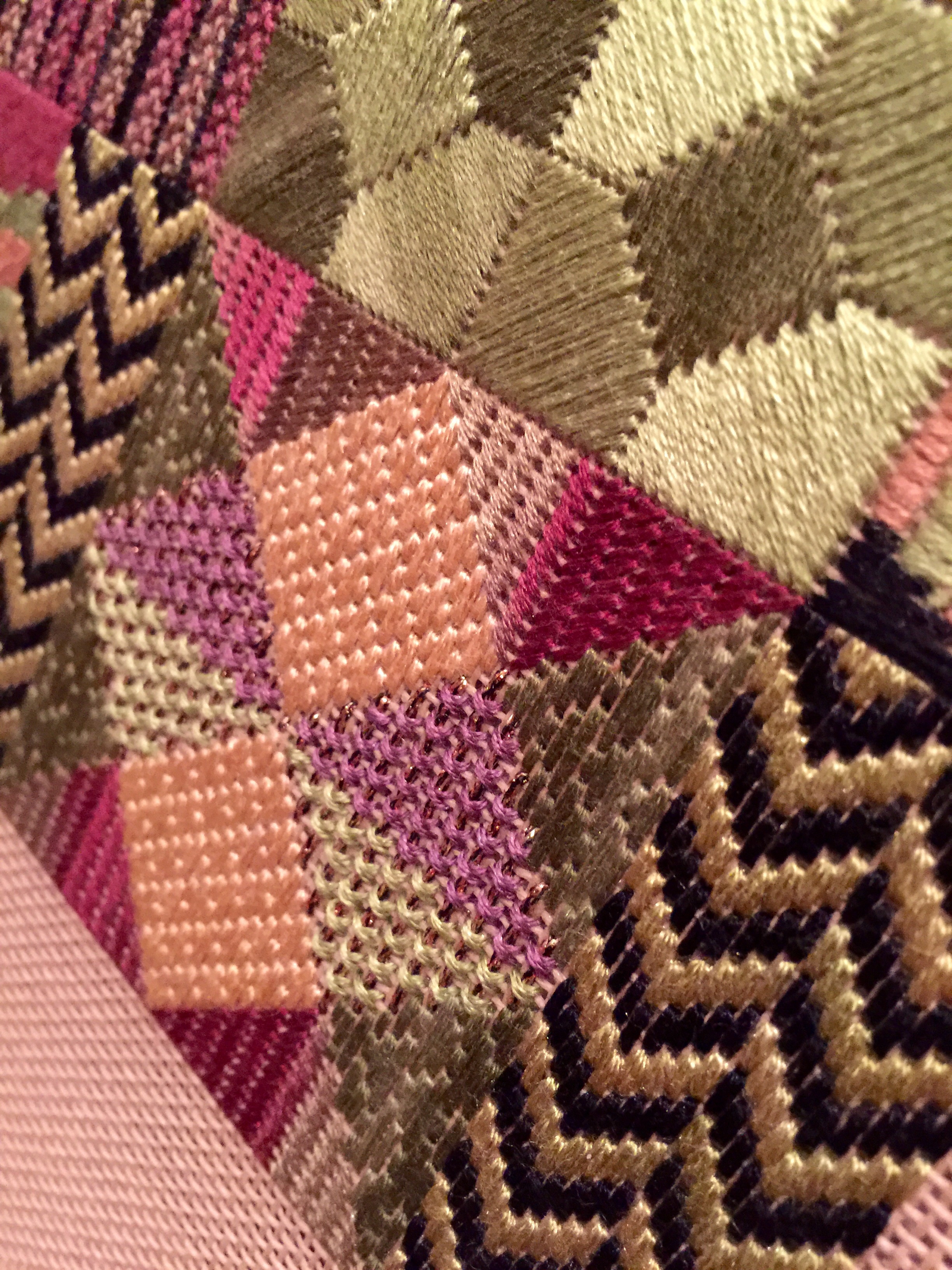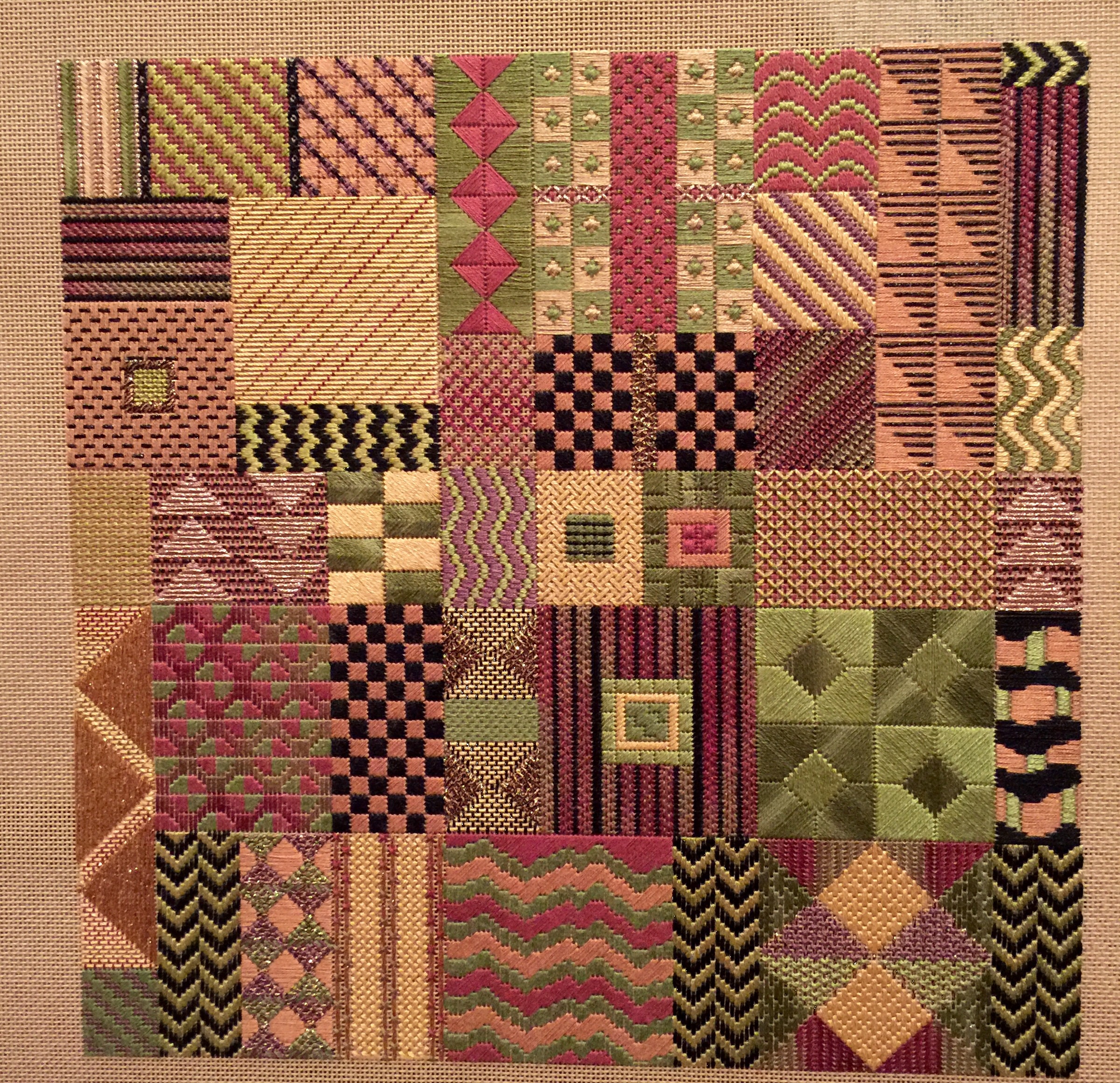 I didn’t intend to jump ahead of the group but after putting the canvas on stretcher bars, 17×17, I realized I wasn’t going to be happy doing this as a travel piece. So I thought I would check out block number one and that led to block number two and three and four and I couldn’t stop myself!