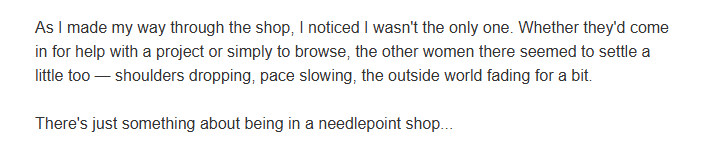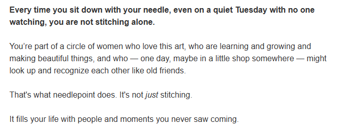I was reading my emails from Ellen Johnson’s Serendipity Needleworks and what she said just struck me as so true. Our needlepoint community is more than stitching – here is how she put it: