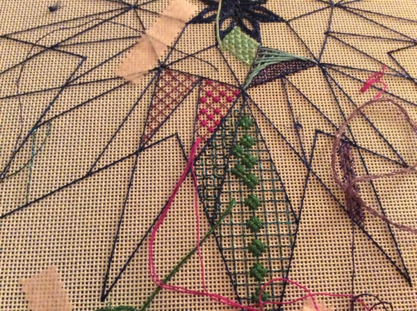 For my own work I put basting lines in my fabric where the edge of foam core would be, so I know I’ve stretched it straight onto the foam core/mat board backing. I just use sewing thread in a color I can see and can easily remove (don’t use floss since it can leave a residue when you pull it out). I rarely do this with needlepoint since typically I’m wrapping it at the edge of the stitching anyway. But you want to make sure the framer understands the importance of getting it completely square. You don’t want to get it back and find it’s off 2 threads from top to bottom, unless that doesn’t bother you – as you can guess, it bothers me :-).