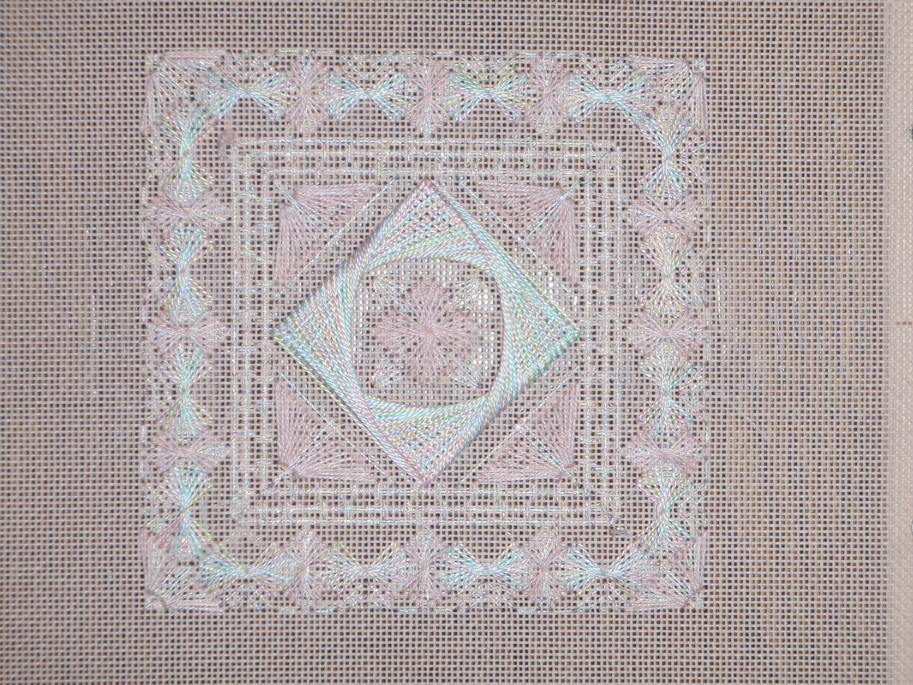 The stitches go pretty quickly and are fun to do. I do like the Cherries on pink canvas. I also finished the Wildflowers colorway on pink canvas — it is very soft and reminds me of the frosting on a wedding cake. Can’t figure out how to add a second picture so I’ll do another blog entry.