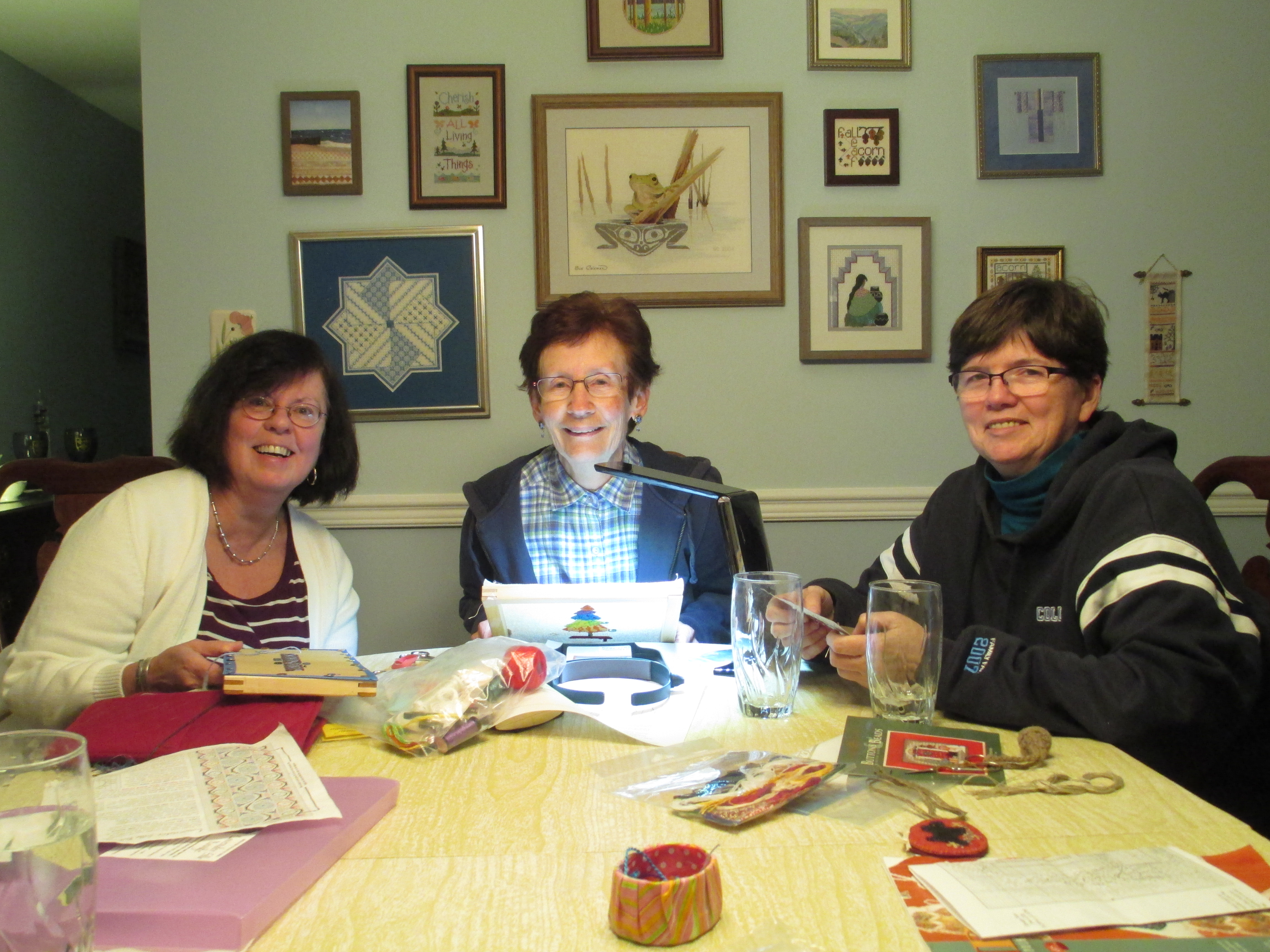 About two weeks ago, I got an e-mail from Sue C inviting me for an impromptu stitch-in at her house. It seems that two of her stitching friends were bunking in with her because they didn’t have power restored after hurricane Sandy. So — we spent a fine Thursday afternoon stitching and making new friends. A great time was had by all!