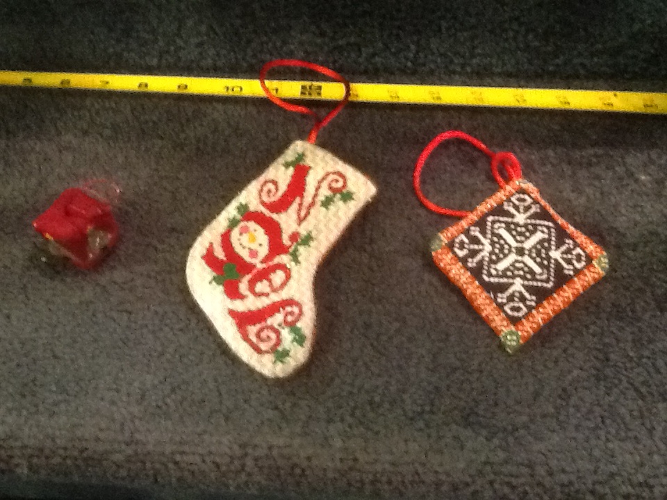 After much deliberation, the choice was narrowed to two. I got both, but will do the one pictured here for my first grandchild. Both selections are by Strictly Christmas, which paints all their stockings the same size, so as not to have jealousy among siblings, which was the case with my two girls. I’ll bring my purchases to the January meeting. I can’t wait to get started.