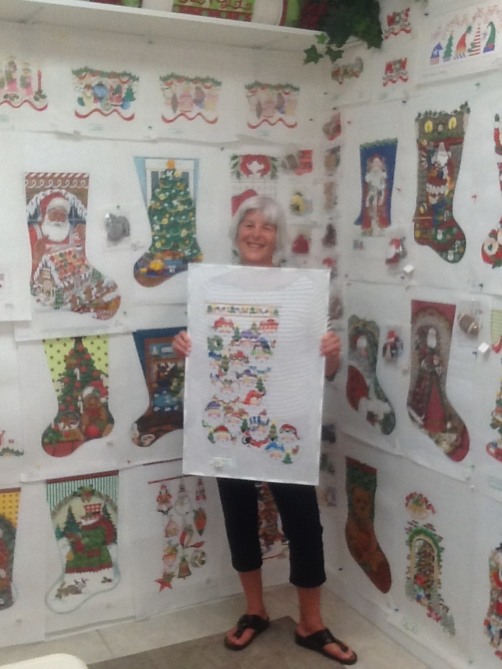 My daughter Margaret and I went to Needlepoint in Paradise to find a stocking for my first grandchild expected to arrive in late May. I wanted Margaret to pick out a stocking she would like for her child. My mother needle pointed stockings for all four of her grandchildren, and I wanted to carry on the tradition. As we walked in, Margaret exclaimed “oh Mom, this is the jam for you!” That means my paradise in her generation. I’ll try to attach a picture of the corner of the store with the stockings.