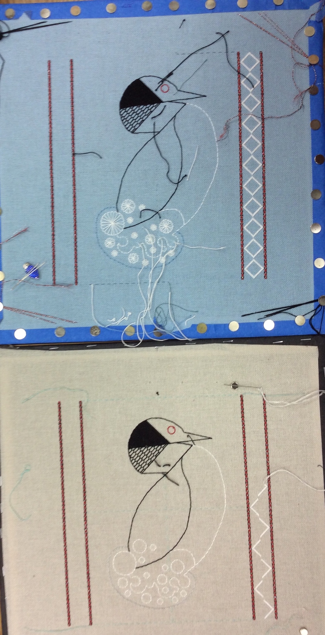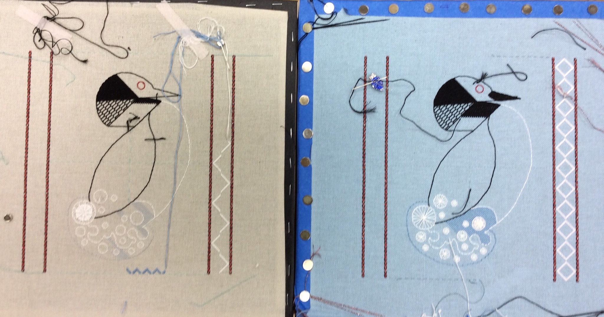 One class member had gotten the blue canvas but the grey threads. It gave a softer view to the background. I decided to try a combination of the blue and grey threads to liven up my background but realized I needed to put in more of the Loon before deciding. At least it’s an option to play with!