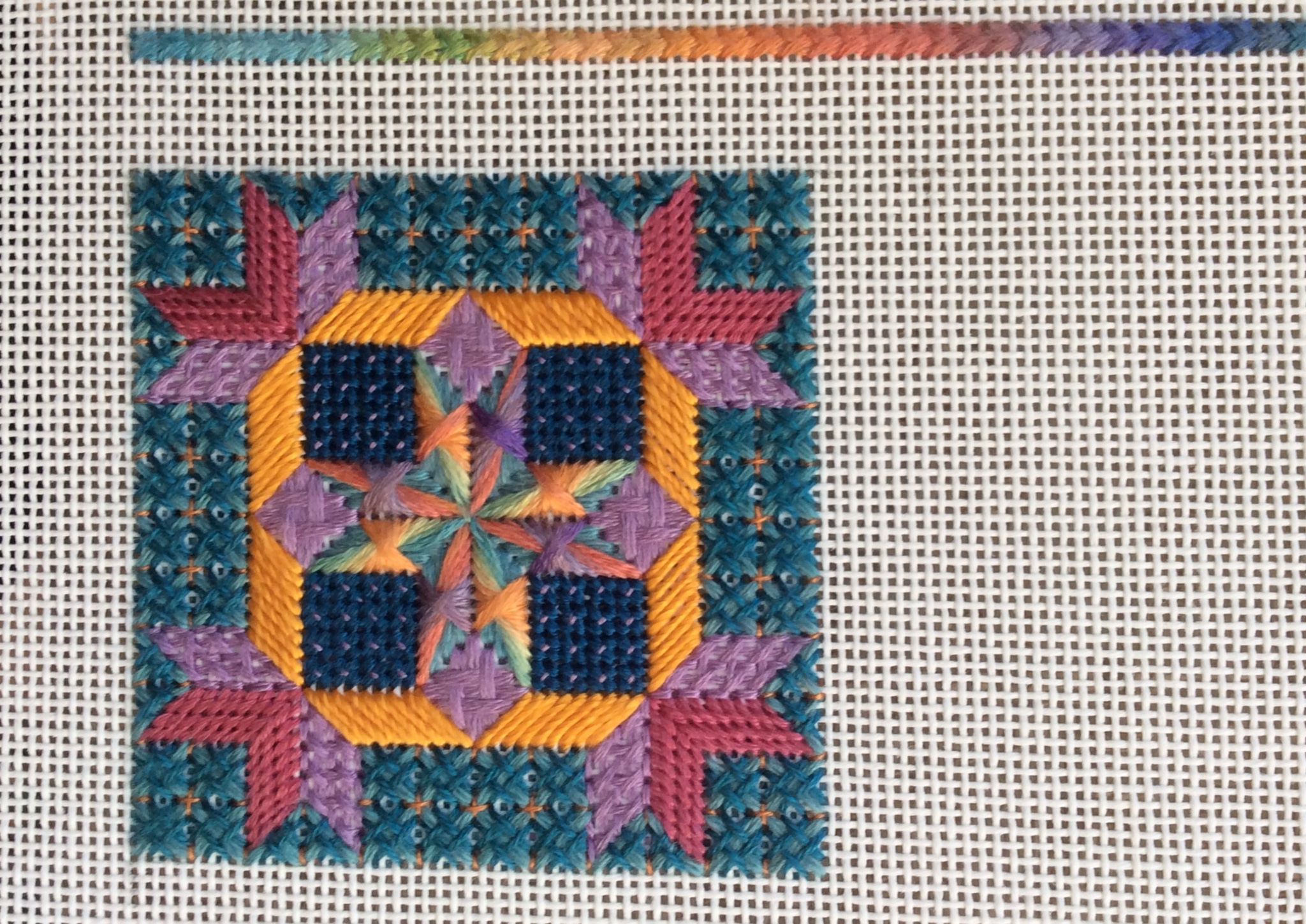 Dee, who is working on A Different View, completed the third octagon yesterday. It is stunning in those colors on the black canvas. She is now deciding on which design to stitch for the fourth octagon.