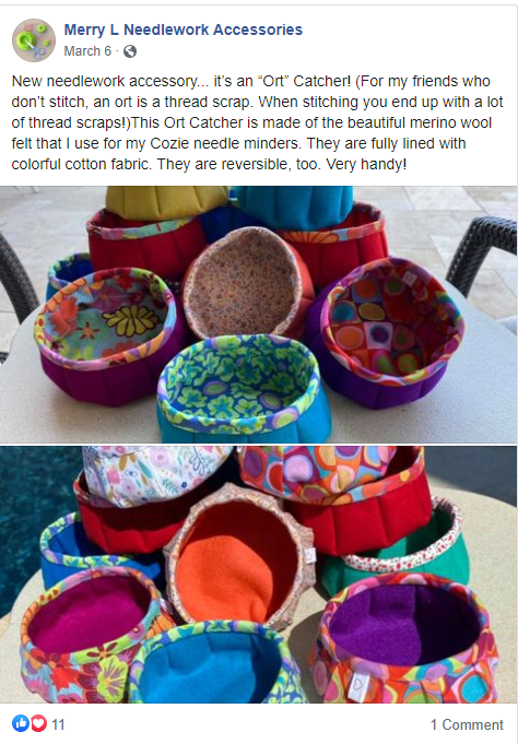 Merry L came out with those great needle minders several years ago that clean your needle. Now they have colorful ort holders that are reversible. They are made with felt which I would think would hold on to the orts – a good thing. Merry L Needlework Accessories – Home | Facebook