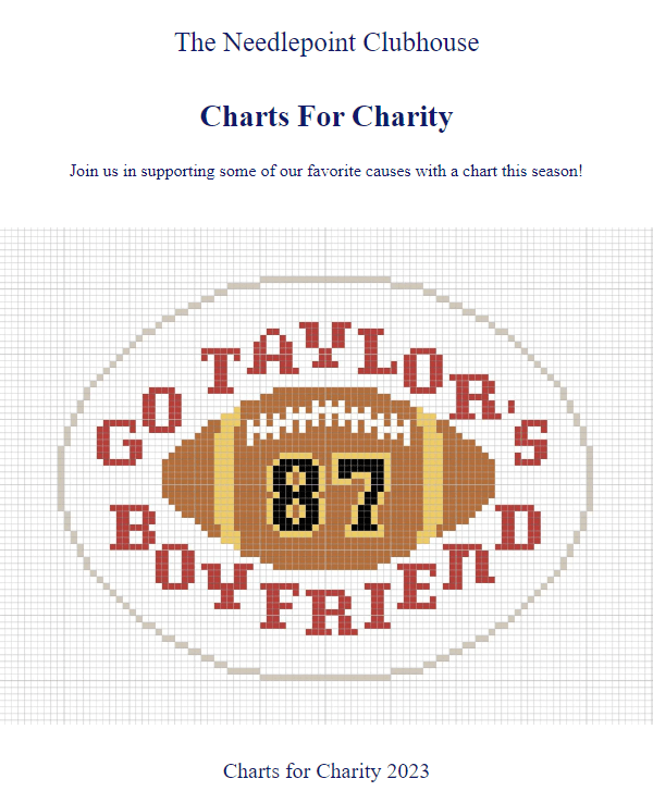 The Needlepoint Clubhouse in Saint Louis MO has a charity event called “Charts for Charity”. I am sure you will all relate to this years chart (below). The proceeds from this chart will go to The Burundi Miracle Project which supports children in Africa. They also have a 2nd charity and the proceeds from “Maddie Sweet Designs will be donated to “Scholarship America” which helps students pursue higher education. https://www.needlepointclubhouse.com/products/charts-for-charity-2023?syclid=cluh4am5ji7s73cir9l0&utm_campaign=emailmarketing_125582868613&utm_medium=email&utm_source=shopify_email