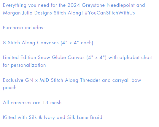 The last blog I told you about the new canvases from Morgan Julia Designs. Greystone Needlepoint in Bryn Mawr is doing an exclusive Bundle for their 2024 Stitch Along. Below shows a list of all you get. The savings is approx $50 !! https://www.greystoneneedlepoint.com/products/gn-x-mjd-2024-stitch-along-bundle