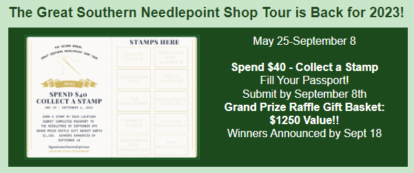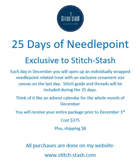 Stitch Stash is doing their “25 Days of Needlepoint” for the 5th year now. You get a box with 25 wrapped items with the last being a canvas and stitch guide. Each package you receive has various threads for the project along with “needlepoint goodies”. Can you open only one package a day??? I think not ! https://stitch-stash.com/collections/25-days-of-needlepoint-sign-up-2022