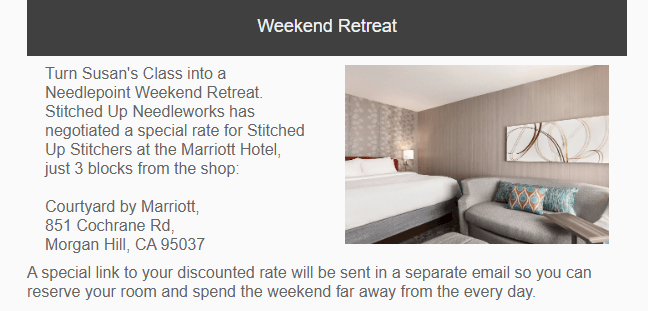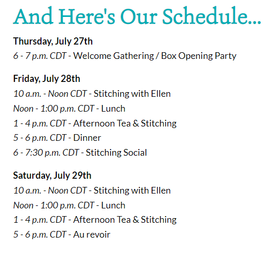 If your a fan of M’s Canvas House then you may already know that September is going to be a big month for them. Meredith Willet is having a retreat over 3 days (14th, 15th and 16th). For $75 you can stitch in the shop for all 3 days and it includes lunch on 2 of the days. For another $25 you can sit with Meredith for a half hour – it’s a bargain. She also has a list of dates that she is doing “M’Bellishment Classes” (see in the photo’s) so you may want to contact the store to see if she has a seat left on one of those days. M’s Canvas House (mscanvashouse.com)