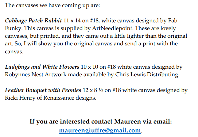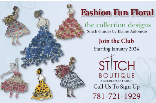The Stitch Boutique has something different – a “Fashion Fun Floral” club. It starts in January to get you into the Spring mode early. Each canvas is only 6X5 but when you look at them – there are all sorts of ways to embellish the dresses. They have 3 stores but they ask you contact the Winchester MA store Stitch Boutique of Boston and Stitch Boutique Winchester – Home