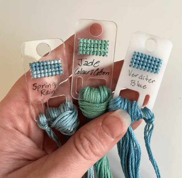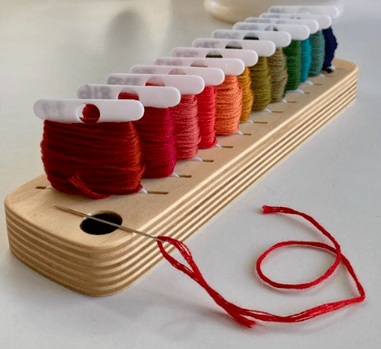 Tip’s and Tricks: Are you doing a project, like a sampler, and your using a lot of floss ?? An easy solution to keeping all those small bobbins for your project accessible is a Bobbin Rack by Modern Hoopla. Not only a nicely made product but a magnetic needleminder is always a plus. Check out their web site for other interesting accessories. Accessories — All — Modern Hoopla- Modern Frames for Handmade Hoops