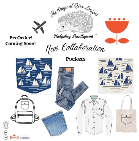 Designer News ! Hedgehog Needlepoint has collaborated with 2 designers to give us all 45 new designs. Hannelore of Hedegehog fame has teamed up with Elizabeth Crane Swartz and Kate Rhees. Elizabeth has her signature colorful dots on a Retro Tag that can be personalized or just use her TTF one (That Took Forever) – fun on a WIP carry bag. Kate has such neat animals on pockets that can be sewn on clothing/bags etc. A neat new idea !! https://hedgehogneedlepoint.com/