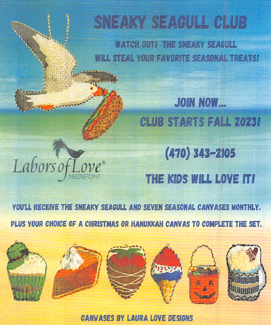 Now for my favorite – From Labors of Love in GA – The Sneaky Seagull Club !! You get the seagull and 7 seasonal canvases with a choice of Christmas or Hanukkah. I didn’t find it on their web site – only in Needlepoint Now Magazine so you should call the store for details. Labors of Love Needlepoint | Atlanta, Georgia | Needlepoint Shop