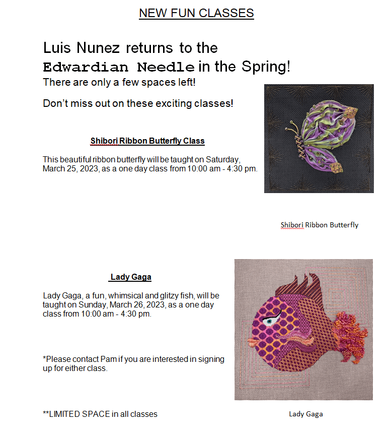 New Books !!! Whimsical Stitches Vol.4 is coming out in June. This book is all about small stitches. It’s perfect for a new stitcher who is looking to start out with ornaments and smaller canvases. (Hmmmm a theme is evolving) It has close to 200 stitches. It also has a section on planning and picking stitches for the small area. Also, Ruth Schmuff has revised the book “Threads, A Needle Necessity” for the 3rd time and it’s now called “Inspired by Threads”. It’s a reference of threads on the market right now. It’s packed with information on each thread and is in a handy 5.5 X 8.5 inch book – easy to take along in your bag. https://bedeckedandbeadazzled.com/2023/03/coming-soon-2/?utm_source=mailpoet&utm_medium=email&utm_campaign=the-last-newslettertotal-posts-from-our-blog-1
