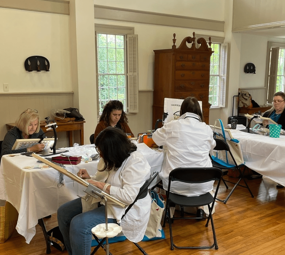 This month’s meeting started our journey into understanding how to pick the right stitch for various places on your painted canvas. Cathryn and Jacki discussed many of the books people buy to get ideas for stitches in various places in the picture painted on the canvas. We even have homework !!! Don’t forget to have ready 3 stitches for the sky area and 3 stitches for clouds. Next month the Blue Ridge canvases that were ordered will be distributed and the discussion on picking stitches as well as threads will continue.