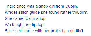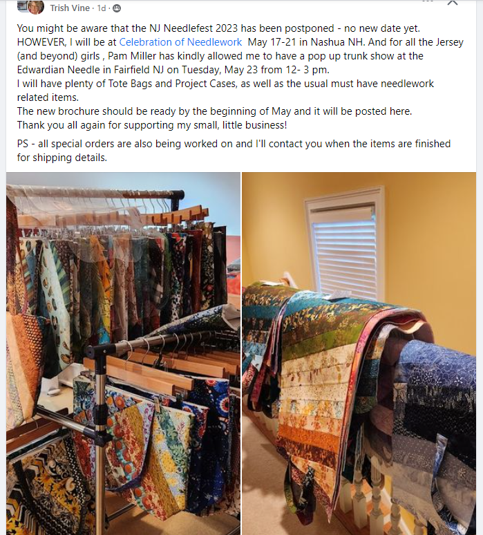Are you a Trish Vine junkie??? I know a lot of people that can’t wait to see what new and different things she is stitching up these days. She will be doing a Pop Up Trunk Show at the Edwardian Needle on May 23rd from 12 to 3 pm. Mark your calendars and get there early before it’s all gone !