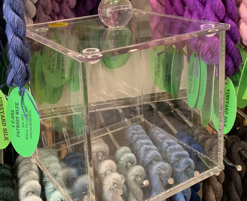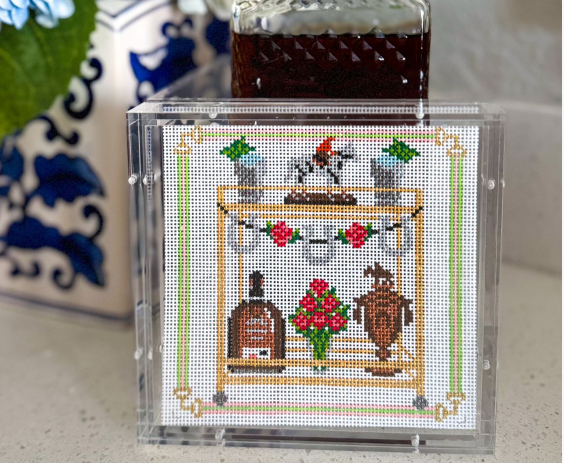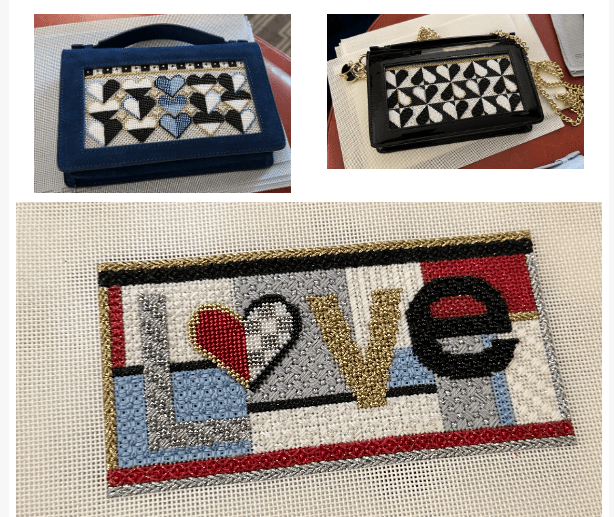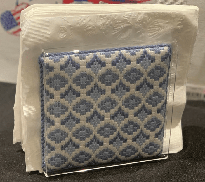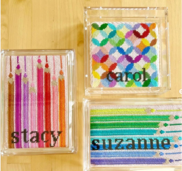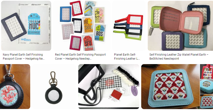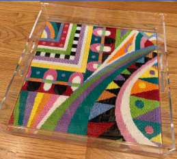 Another way to go is by using self finishing items. Stitch By Stitch in NY has a large array of handbags, jewelry boxes, luggage tags… and just beautiful Acrylic boxes. I had never seen an acrylic napkin holder before but they have it. They also have an acrylic candy box and a wide selection of the Penny Linn boxes with the magnets. Great to be able to change the needlepoint for different occasions. Needlepoint Canvases, Kits & Supplies | Stitch by Stitch (stitchbystitchneedlepoint.com)