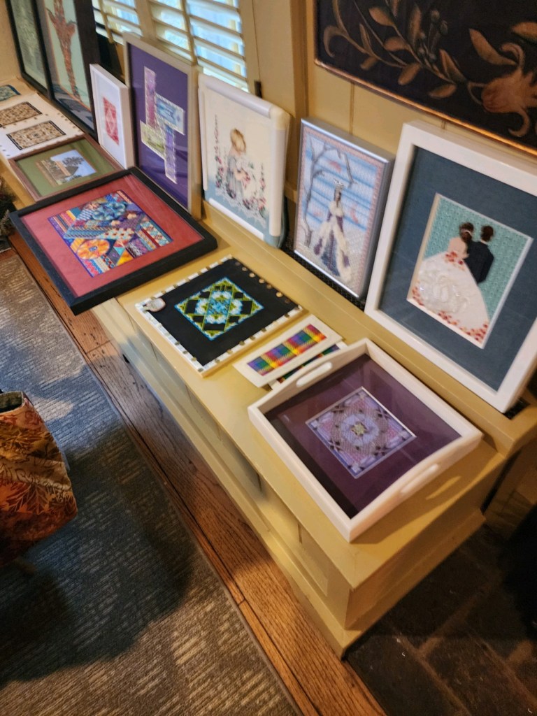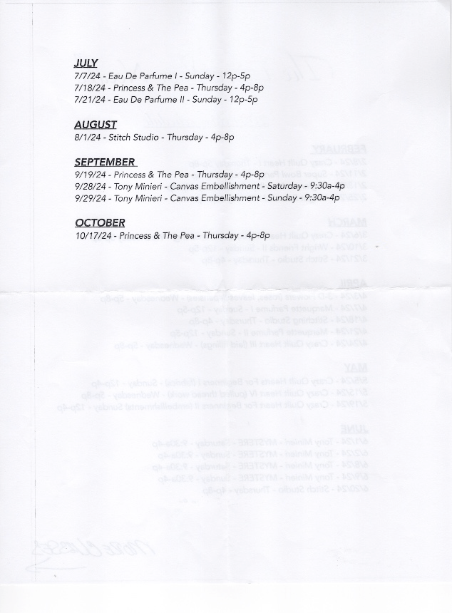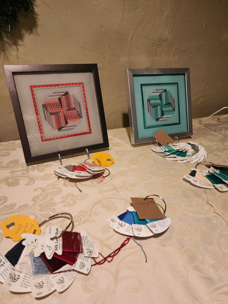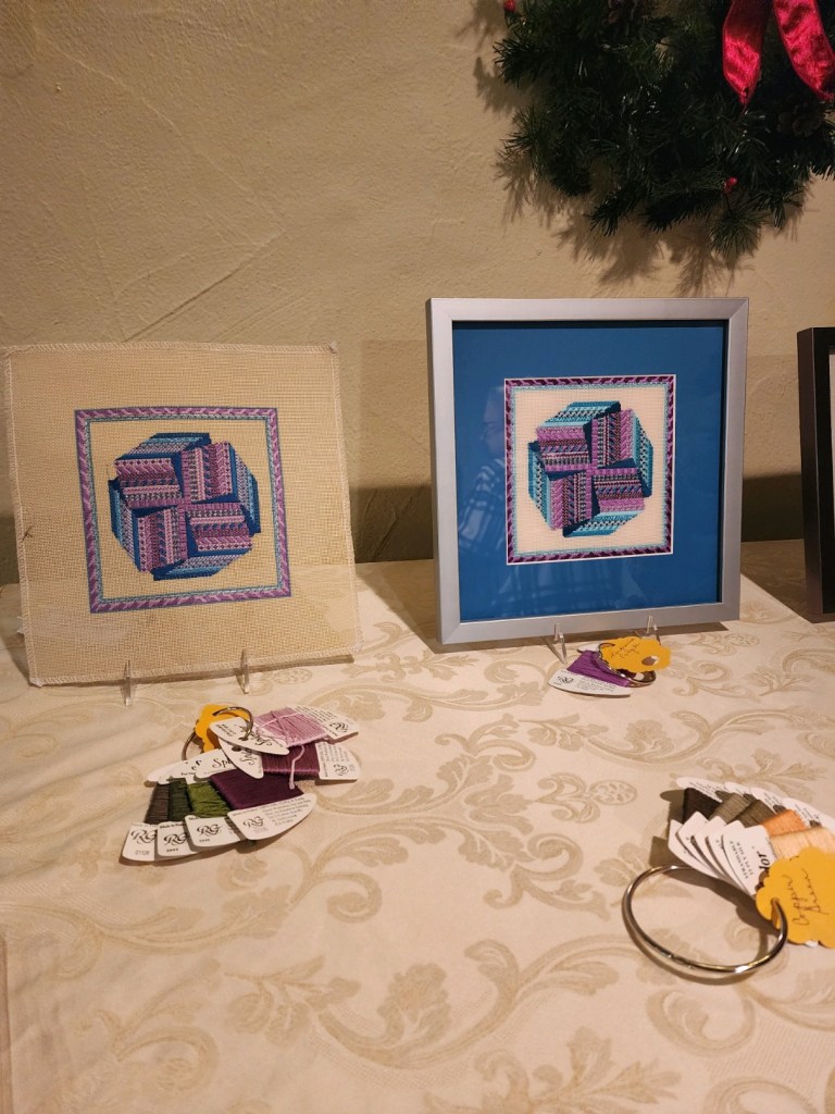 Hope you remembered to attend the meeting since it was on a different day this past month. June is the next time that our meeting will be on a different day of the month – I’ll remind you !! If you missed then you missed the next part to be stitched on Tumbling Stripes. Everyone is stitching the next four stripes and spoiler alert – the next 3 are the following month. You also missed the talk Jacqui C. gave on using a laying tool and the different kinds you can buy. Loved her description of how the threads should line up on the tool like they are the Rockette’s !! Yes – we actually have fun at our meetings!! You need to belong to join in the fun !
