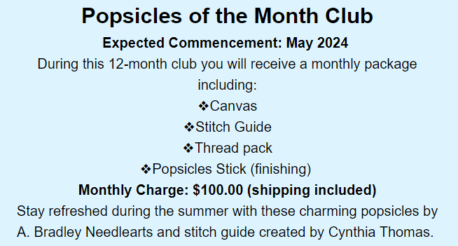 You may remember this cute Summer Memories canvas by Pippin. The Needlepointer has now turned it into a club. Each month you get threads and a stitch guide for one of the sections so this is only a 6 month club. The guides are by various designers – Meredith Willett, Laura Taylor, David McCaskill, Jill Rigoli and Patricia Sone. Nothing says summer like mosquito’s and ice cream. https://www.theneedlepointer.com/summer-memoriesdiv-idclubsubtitleopen-enrollmentdiv/p8511321?cse=nl030924&goal=0_3621358244-4e44ba89f5-69343533&mc_cid=4e44ba89f5&mc_eid=2e6039e84f