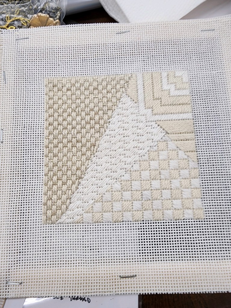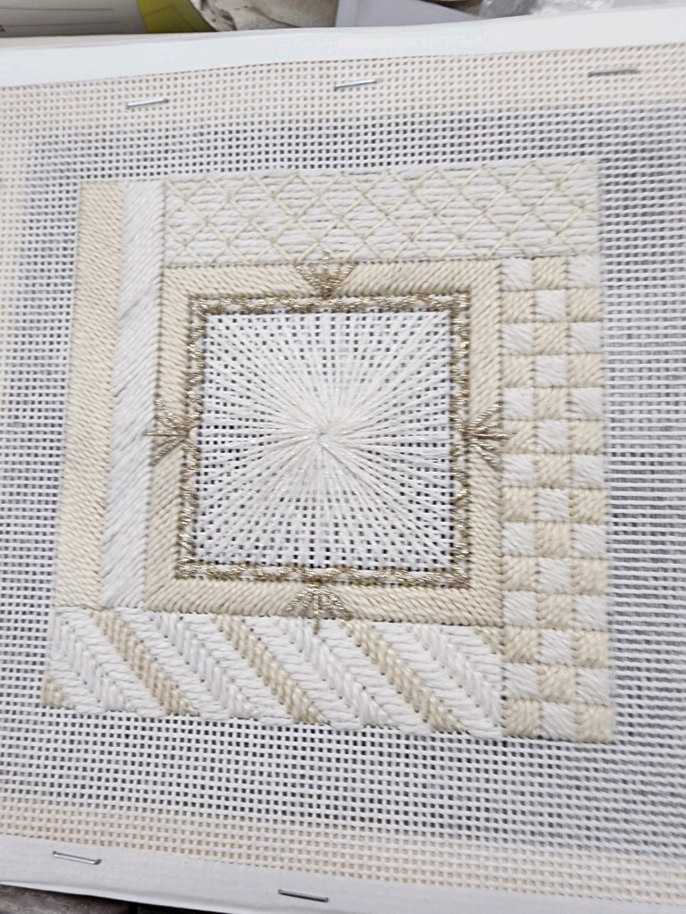 Tips and Tricks: I was reading about how to deal with the self finishing items they now have. I was stunned to read that “needlepoint stitches are longer horizontally than they are vertically!” This means that we were not crazy when things we stitched were not quite square !! Measuring for these items is very important as the painted area may be short of the opening and you need 2 rows to tuck under the edge. Next time I’ll have more tips on doing self finishing !
