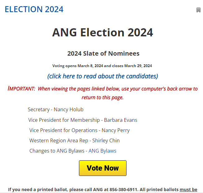 Don’t forget to vote !!!! You should have gotten an email on 3/8 with a link to vote for the 2024 slate of nominees and the changes to the By-Laws. You can always log in on the ANG web site and vote.