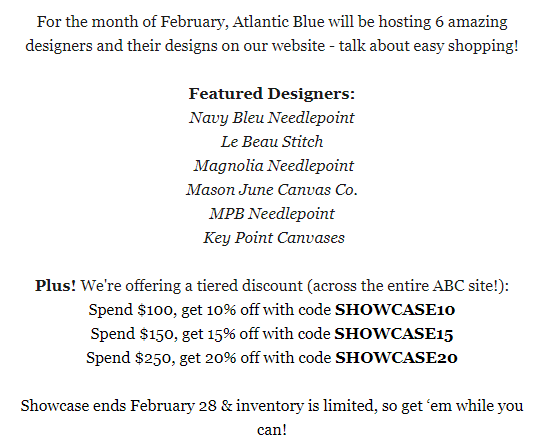 New needlepoint designers are showing up all over. Could this mean that younger people are becoming more and more interested in our favorite hobby?? Hope so ! Atlantic Blue is showcasing 6 new designers and they have a special sale to celebrate them. There were so many to look at I only showed you a few. Look at the web site for lots of choices. https://www.atlanticbluecanvas.com/collections/emerging-designer-showcase?_kx=_6T6ZEqw3FzRTyL6whjCxpBoWNmvx7M7ogeQHpVHlzk.SdsruM