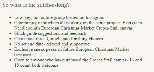 NJNA is thinking about doing a SOTM but the details are not yet in place. Let us know if you would be interested in joining in. In the mean time Evergreen Needlepoint in Greensboro NC is doing a “Stitch Along”. They just started to work on a small canvas of a European Market Christmas Stall that sells crepes. It’s an easy project and just adorable. See below for how this is run. The picture brings to mind a future village of these stalls. Contact the store for more information. https://www.evergreenneedlepoint.com/products/european-christmas-market-stall-crepes?se_activity_id=158344839407&syclid=cujq1hfq6hqc738e48gg&utm_campaign=Join+the+Crepes+Stall+Stitch-a-Long%21+_158344839407&utm_medium=email&utm_source=shopify_email