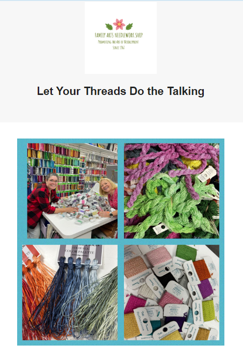 Family Arts Needlework in Arizona is very excited about lots of new threads coming to their store. From Boucle to Planet Earth they have a “crayon box” of new colors. They also LOVE the new way that Kreinik comes on the cards – so much so that they are having a sale on all Kreinik spools – ready?? – $1 a piece. Better hurry !! https://familyartsneedlework.com/