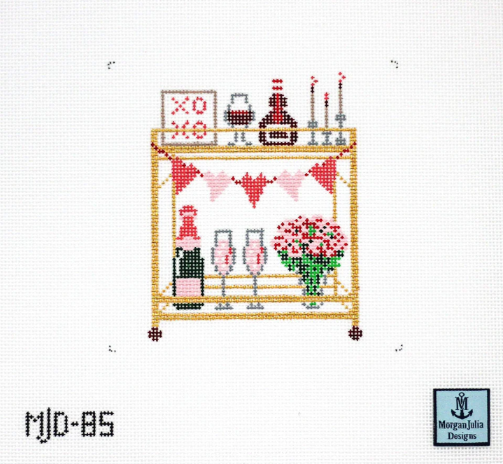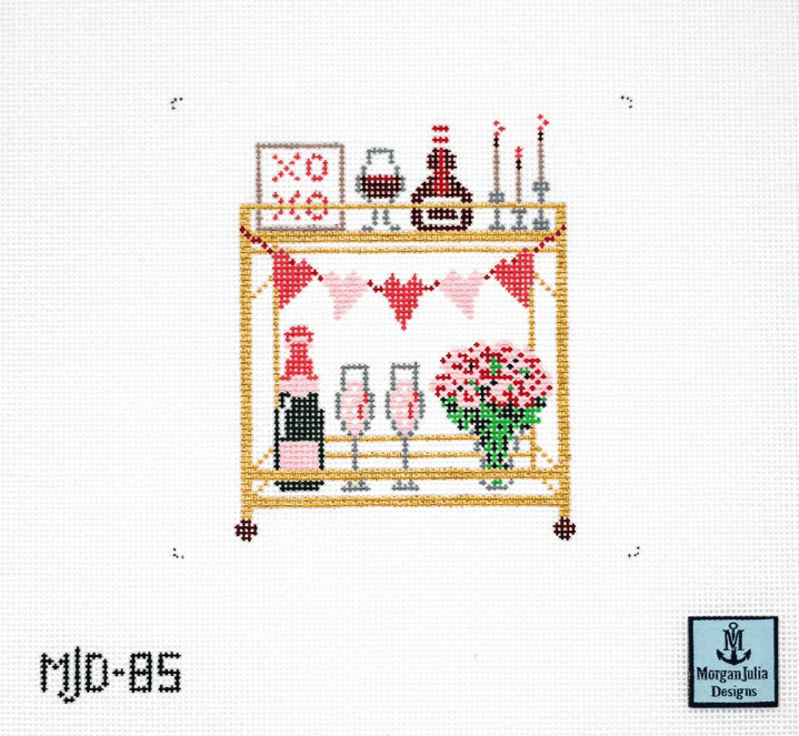 On a different tone for Valentine’s Day you can go with Morgan Julia’s Valentine’s Day bar cart. It’s small so it’s a quick stitch. If you choose to have them kit it then they send you: Pepper Pot Silk, a cut up skein of Essentials, Essentials Cards, Silk Lame Braid, and Petite Very Velvet. https://morganjuliadesigns.com/collections/bar-carts/products/valentines-day-bar-cart-needlepoint-canvas?variant=42678915268806&_kx=rV4MBEfWGkwURglkyUXCLopGavY2DCJQzP6Y94aO8T4.RWeQns