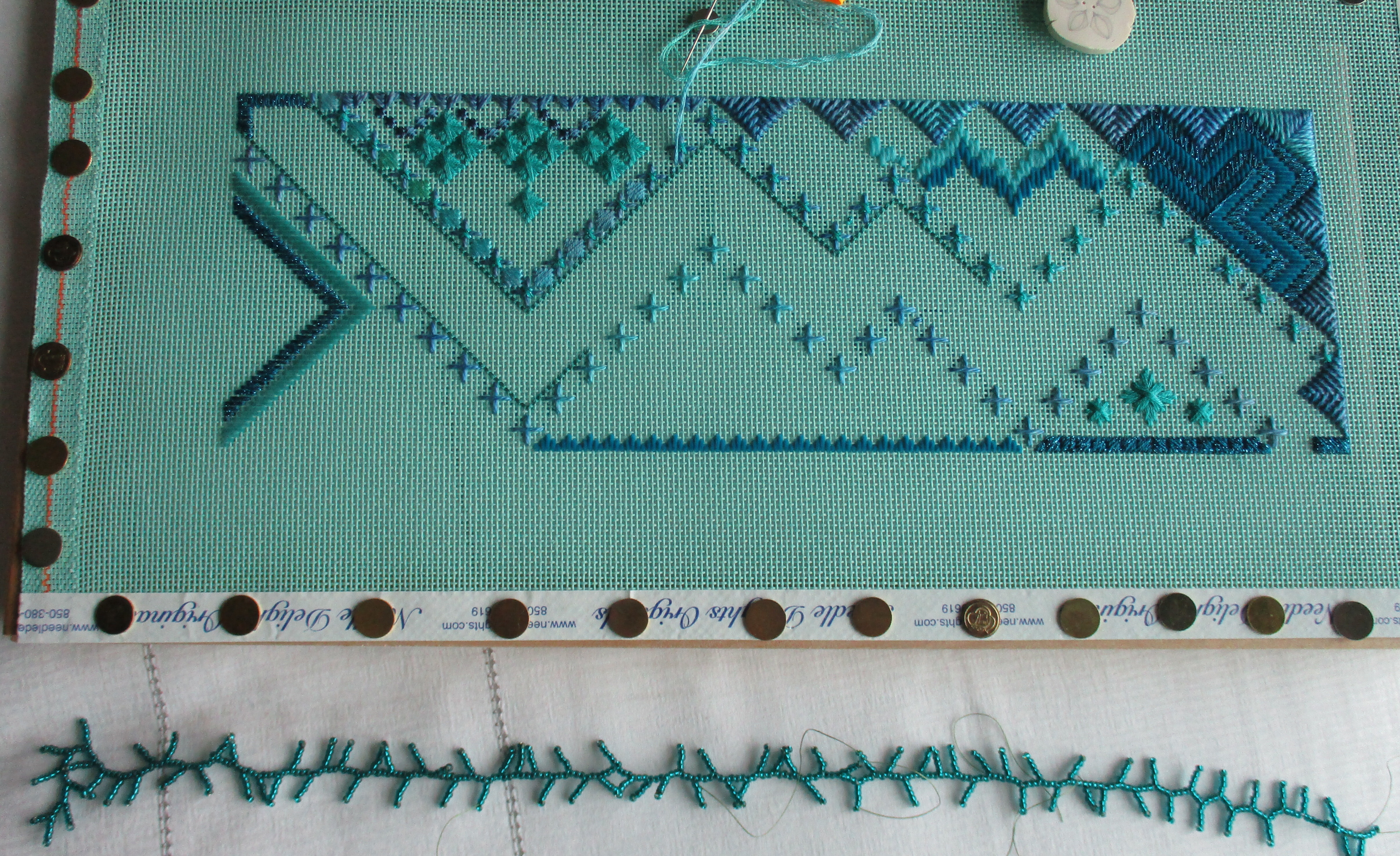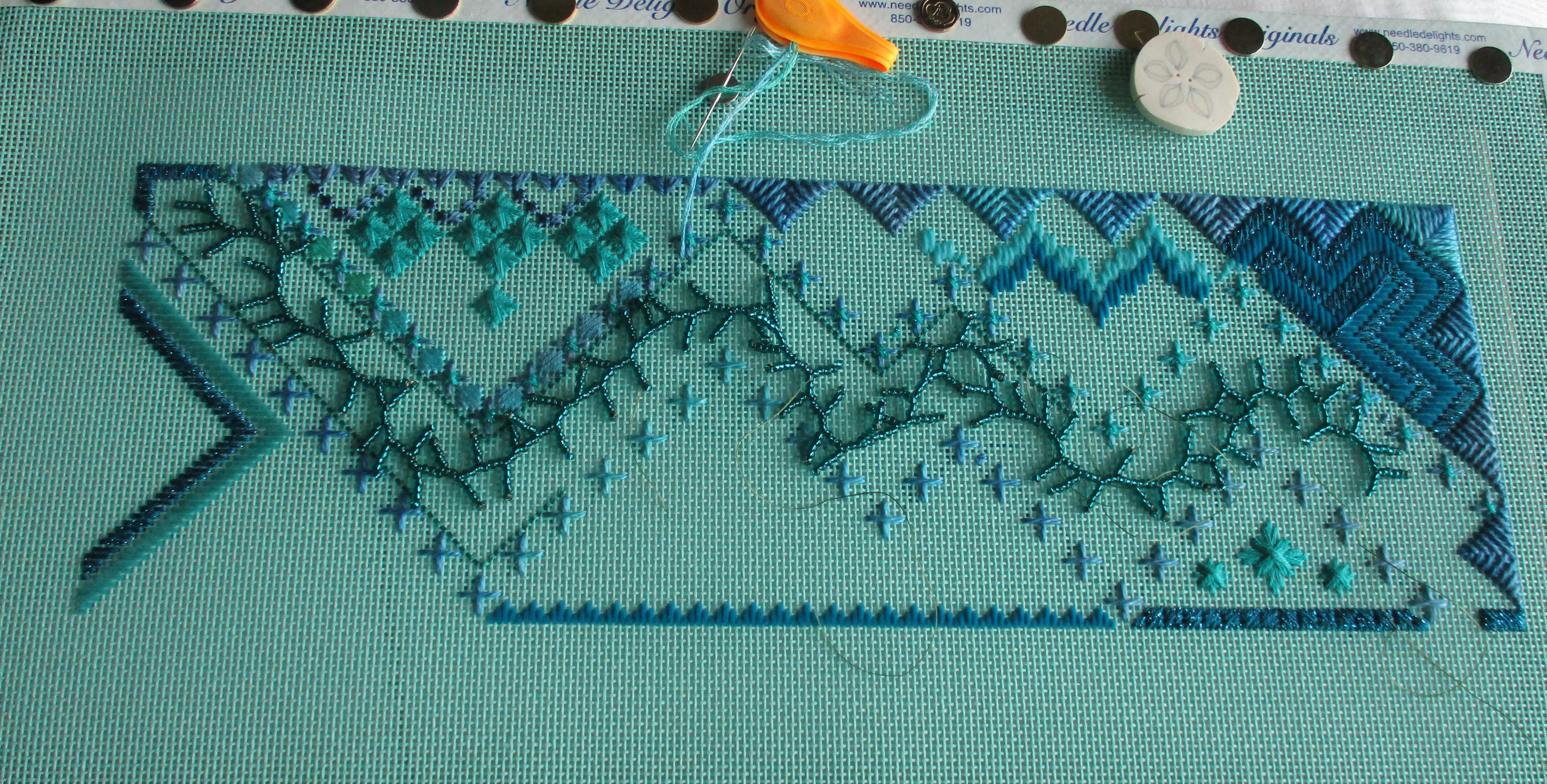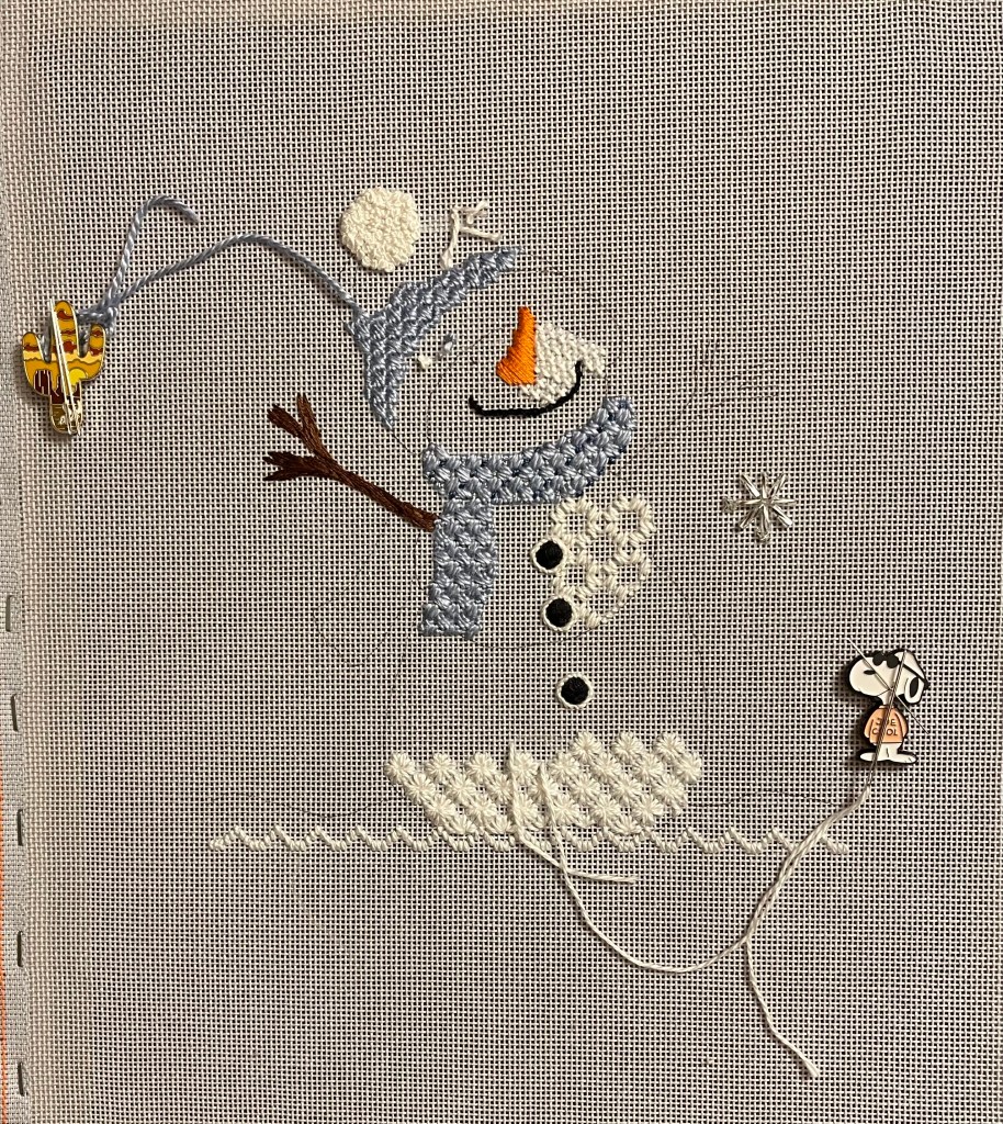 My first class started on Saturday and was a two-day class with Dawn Donnelly – Mr. Sparkles. This was a very popular class and I heard that it sold out at registration in under 10 minutes. Dawn is a great teacher and the design is just so cute – perfect for my after Christmas/New Year theme of snowpeople. Here’s my progress after the two days. And those are two of my new needleminders.