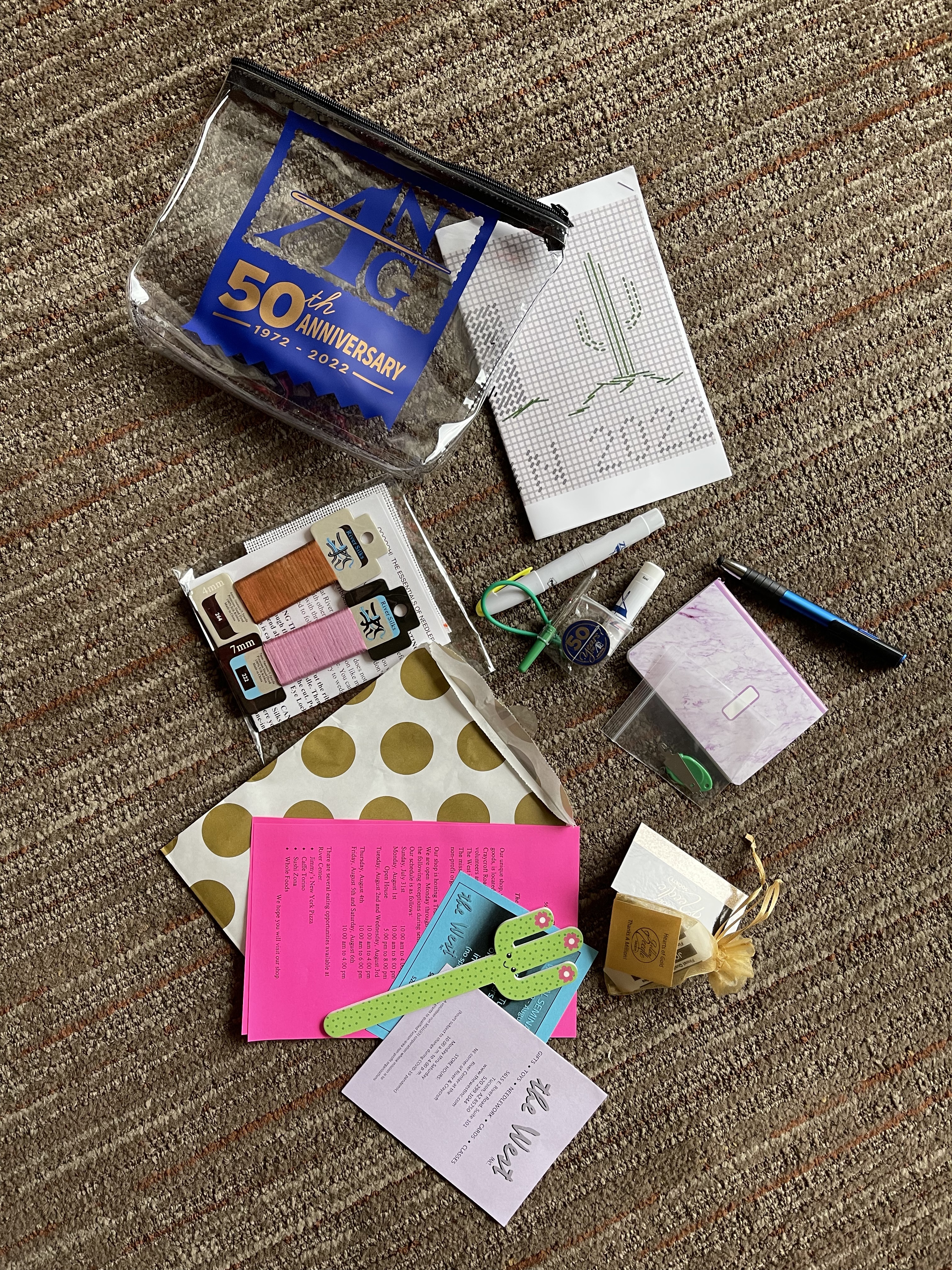 On Thursday we drove to Tucson for the ANG Seminar. We were able to check into our room in early afternoon and I was able to pick up my registration material as well. Instead of a gift at the Opening Banquet, it was given out at the registration desk along with some goodies from River Silk and The West, the needlework shop here in Tucson.