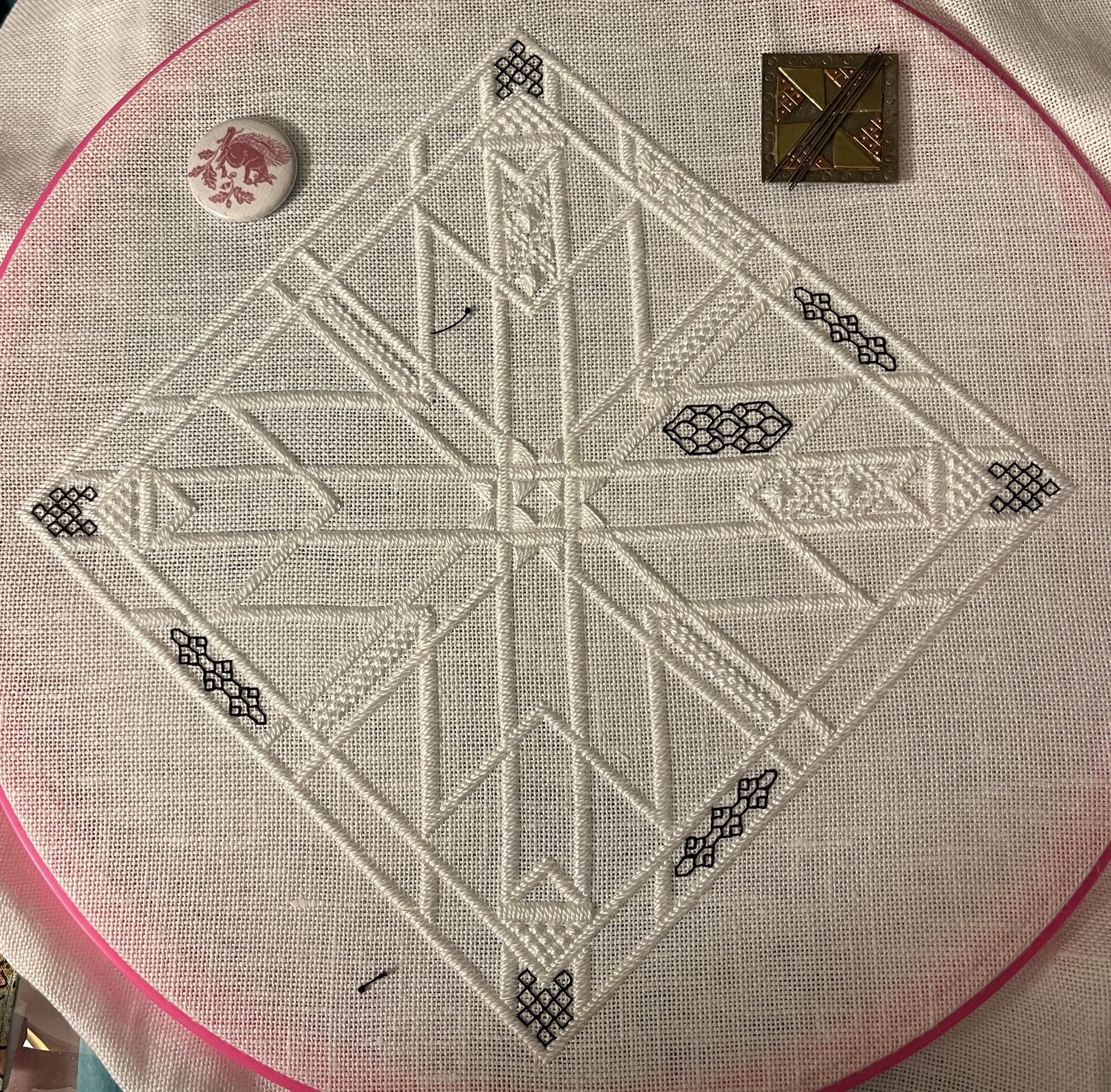 Today I started my second class with Terri Bay – Dragonfly Mandala, which is a whitework/blackwork/pulled thread design. The first day was devoted to surface embroidery and blackwork. Tomorrow we are supposed to come to class angry so that we can pull the linen tightly. My progress from Day One is shown below (the satin stitched outline was pre-work – I did not become a turbo stitcher).