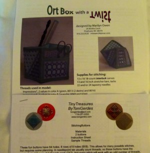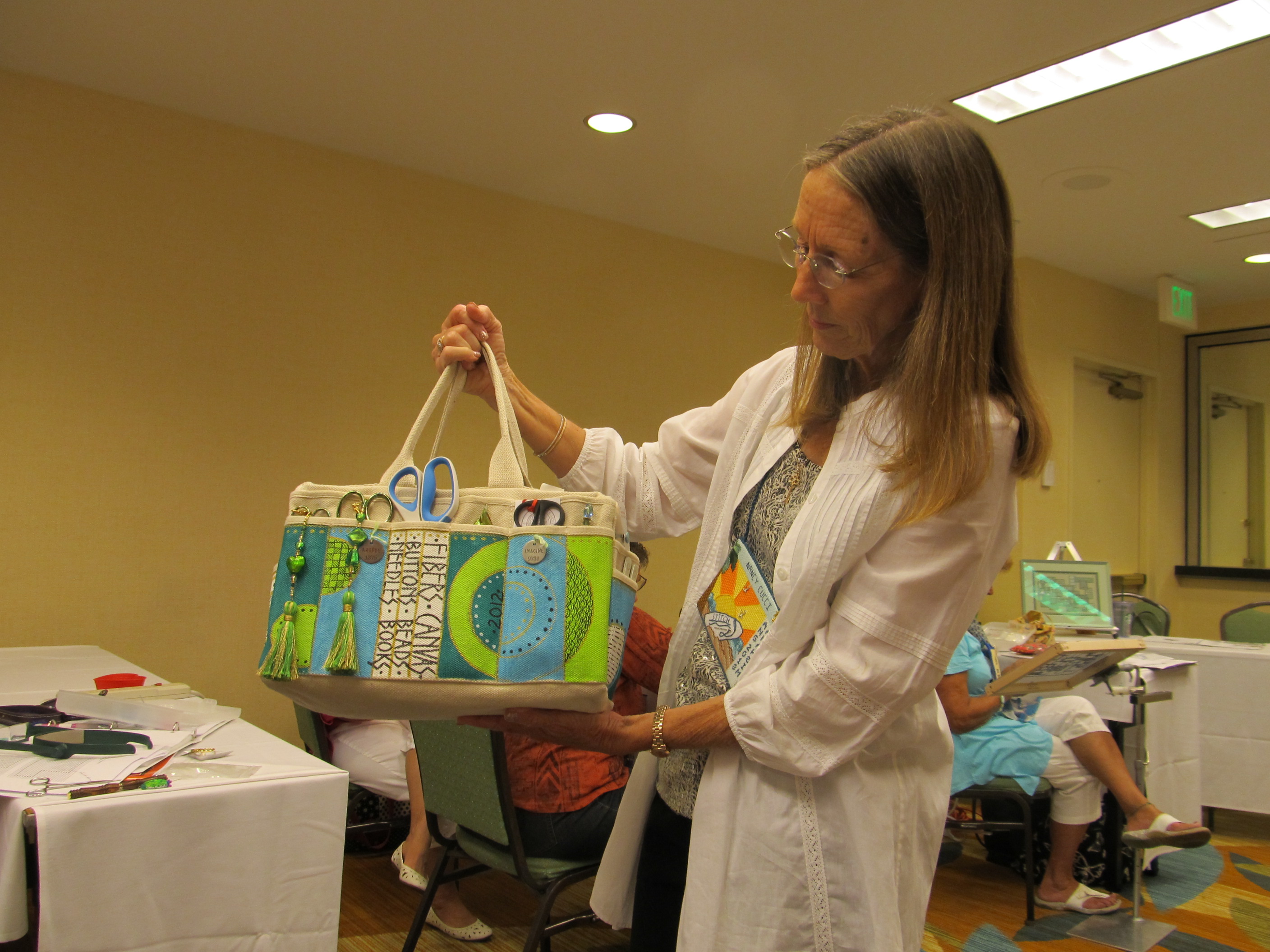 This wonderful tote starts out as a tool carrier in plain canvas from Harbor Freight. Her friend then used acrylic paint to paint the background rectangles and a paint pen to decorate the background. This has so many compartments, handles, etc. I think this would make a wonderful chapter project. BTW, I also learned how to make a foam board carrier for in-process needlepoint. Another potential chapter project!