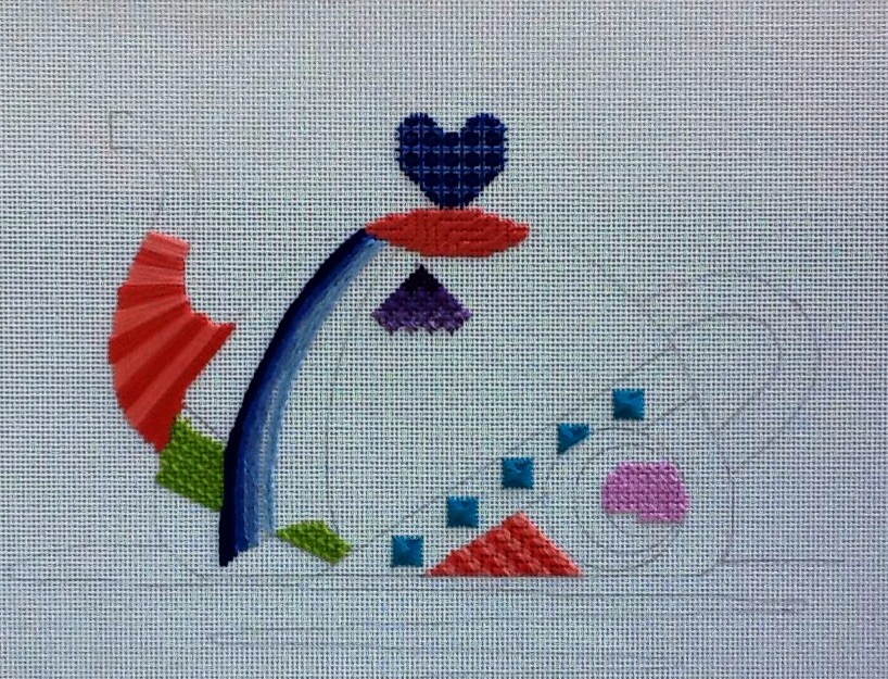 I began the second class today which is much more relaxing than the last class as it is not all new and different. My main challenge in this class is stitching inside the lines, or deciding where the lines are and how to keep those curves smooth. The teacher, Dawn Donnelly, designed this after looking at the polymer clay covered decorative tea pots. So as you can imagine the colors are bright, but not sharp, if that makes sense. Threads are perle, floss, Splendor and Needlepoint Silk. Some class members were saying that they would like bling added and were thinking of ways to add some bling, but I think the piece is cheerful as it is and the colors do remind me of the polymer clay.