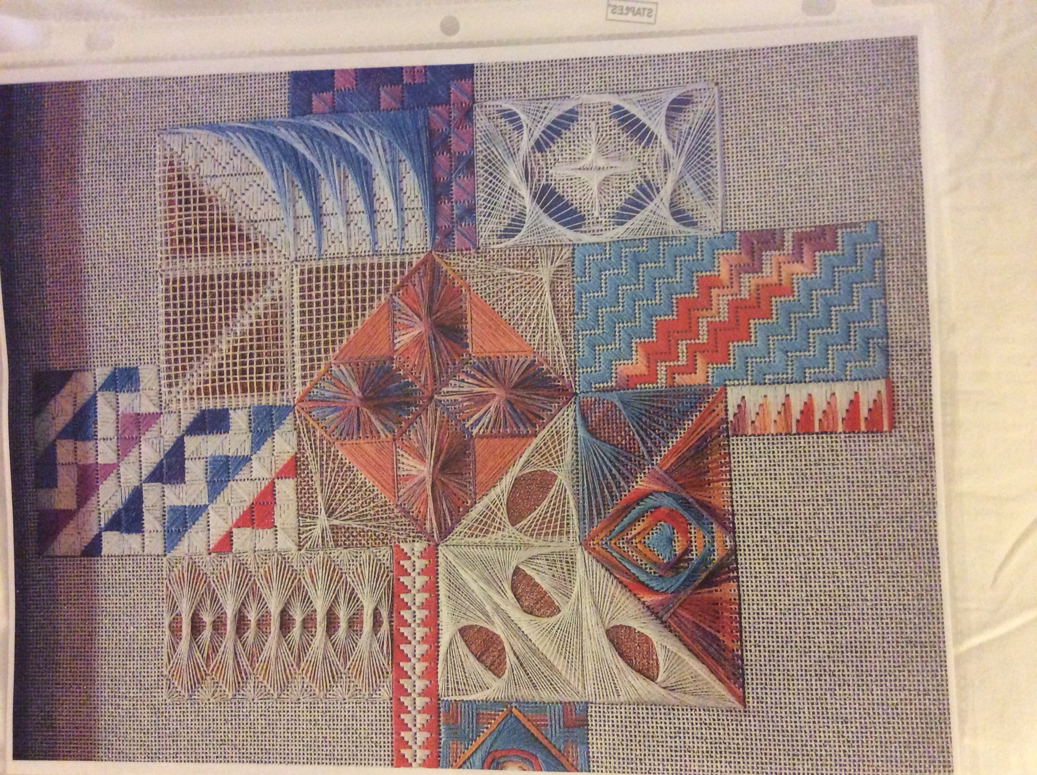 Today we focused on sections 4 and 5. Section 4 has Rhodes, scotch, and Byzantine stitches. I loved Jackie's suggestion on the Rhodes to add a final stitch that is the same as 1-2; it gives a nice definition to the stitch. Section 5 is fabulous but complex. We began by doing padding sections where we had to watch the stitch counts and placements. Once that was done, we did 4 Hilton triangles – one in each corner – that overlap each other. Once again, getting the stitch counts correct was critical. We then filled the center with 2 triangular Rhodes. I actually finished the section as you can see. It is dramatic!