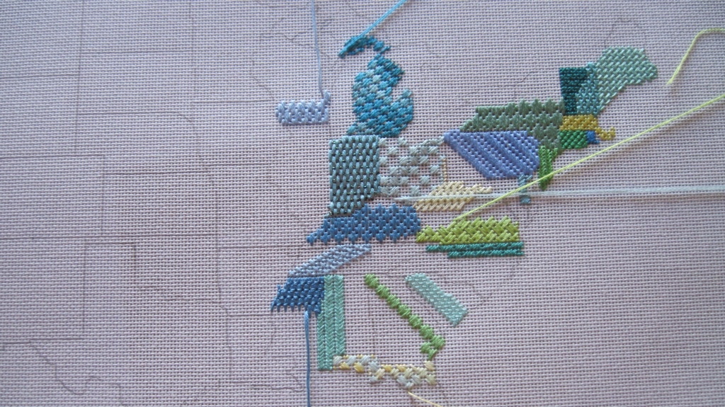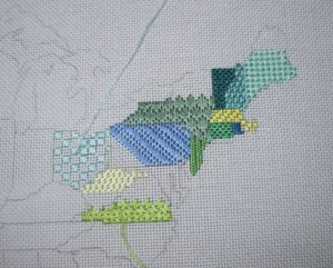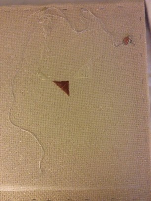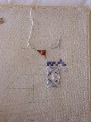 I was so frustrated yesterday with having to redo sections because my counts were off, I finally started basting around the different sections last night after dinner! What a difference it made today for knowing where to begin each section. You can see the shapes off the different sections outlined below – lots of trapezoidal, rectangles, triangles with a square in the center. There are 14 sections In all so I still have a little basting to do.