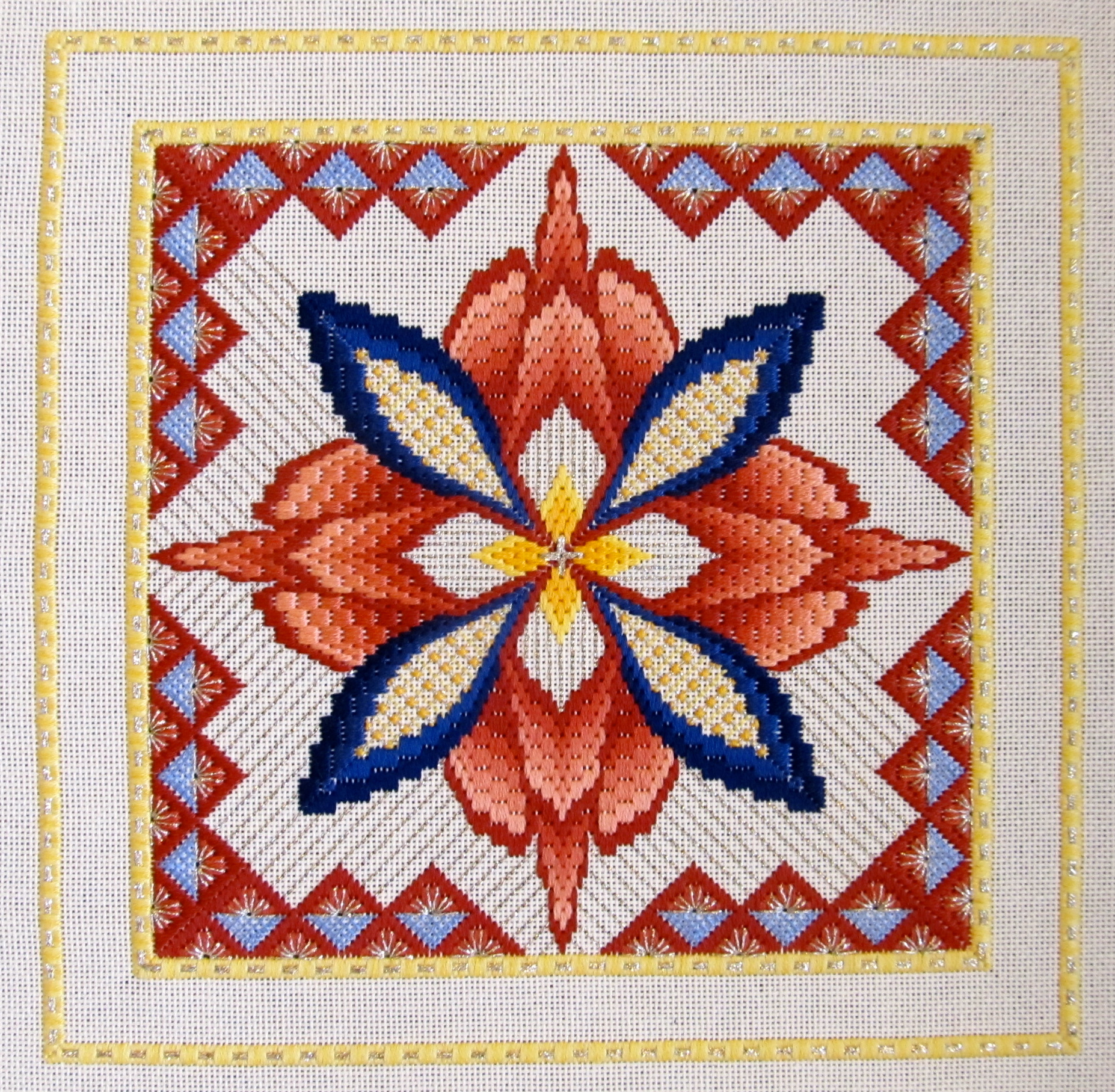 Diane had mentioned that she had a friend from college, Jackie, that was a teacher of canvas work. It appears that Jackie has a piece in next year’s EGA seminar called “Diamond Panes”. It’s lovely and one that I circled as a possibility for Phoenix. So please check that one out on the EGA website also!