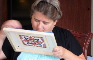 One of the things that we did was look over the offerings of classes for next year’s EGA in Phoenix. There was a magnificent Or Nue piece with two butterflies. The gold was couched in swirls. It’s going to be a one day class focusing on the technique. I wasn’t allowed to take a picture but I understand that all of next year’s class pictures will be up on the EGA website at the end of this week. I guarantee that it will be worth your while to take a look.