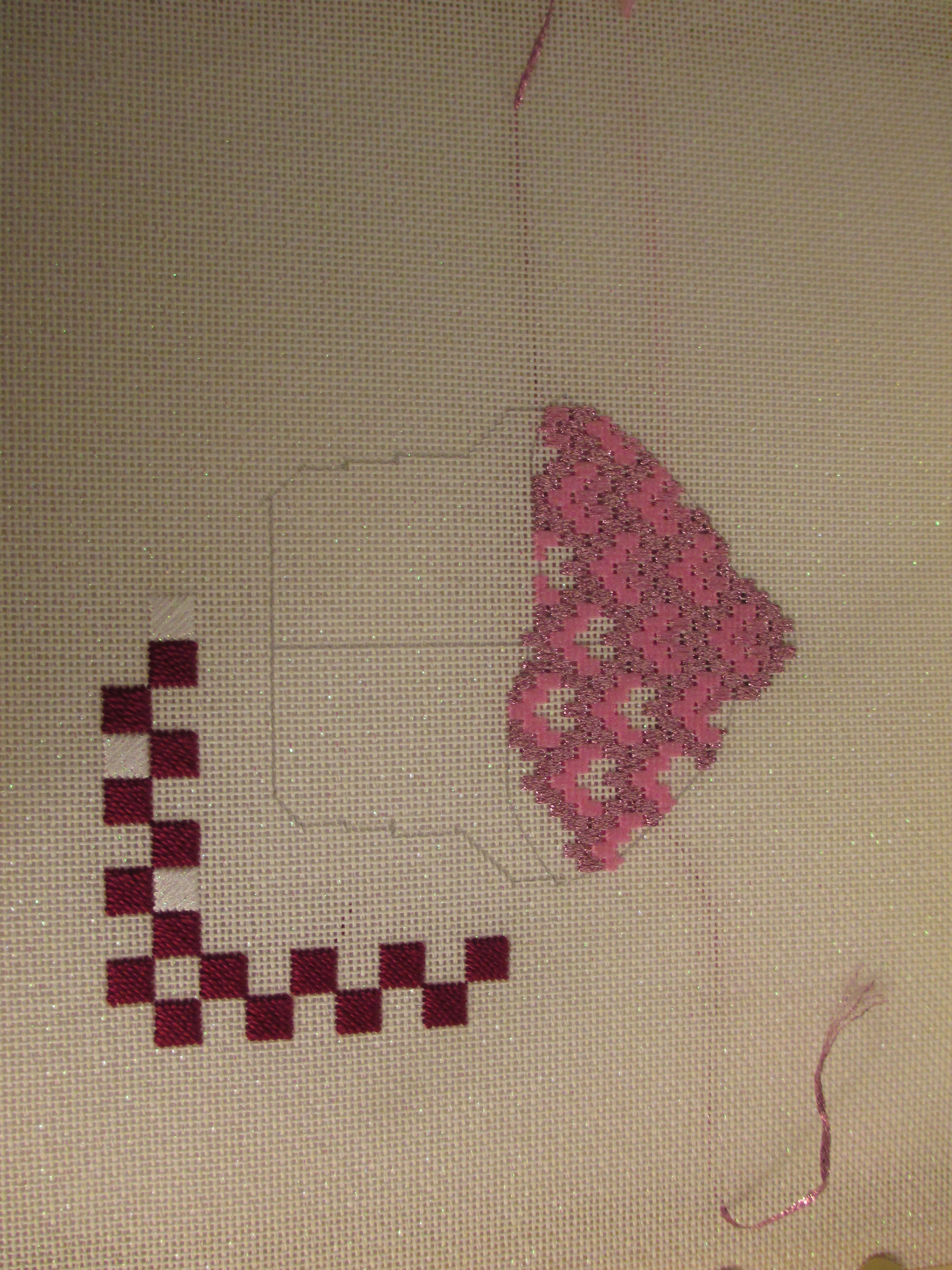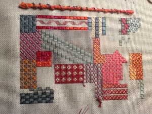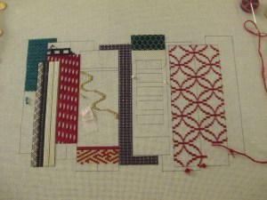 The reason that I chose to show you this picture is that a canvas called “The Fishing Lady on Boston Commons” won a prize at the ANG Exhibits this year. Apparently this used to be a very romantic notion and so all the young girls wanted to stitch a canvas like this. There were two others in the Winterthur room where this one was displayed! (Another intricate sampler was signed by the stitcher, aged 14.)