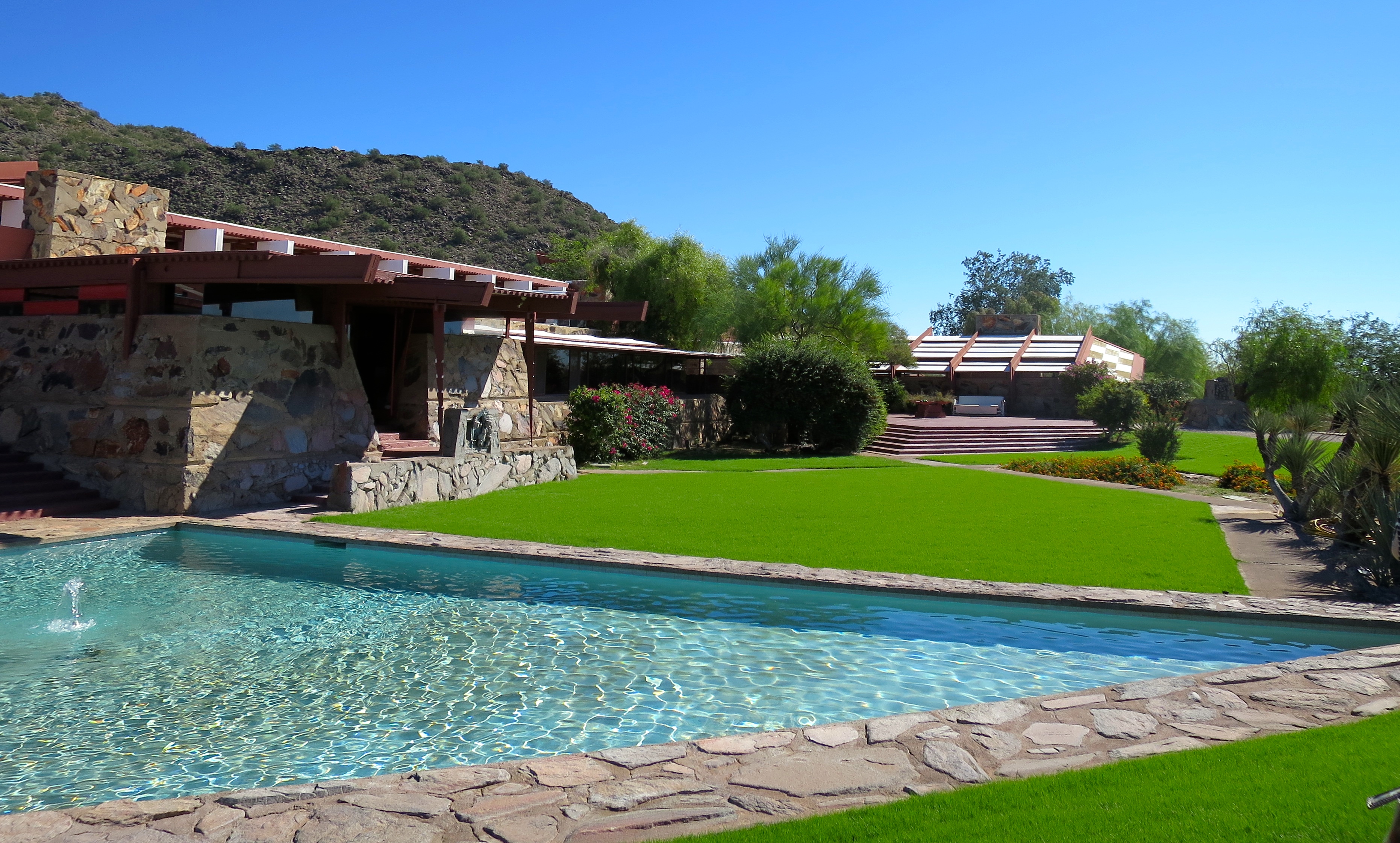 “Taliesin” means shining brow. Wright believed that the architecture should fit into the environment and not overshadow it. Therefore, the structure sits below the top of the mountain and no structure is higher than the surrounding trees in this case the Palo Verde trees.
