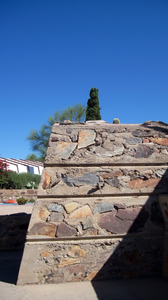 Next we went to Frank Lloyd Wright’s “Camp” at Taliesin West. Wright built Taliesin during the depression when his third wife suggested that since he didn’t have any commissions that he should teach. Taliesin West still functions as an accredited school for architects — during the winter months. During the summer, the students migrate to the original Taliesin in Wisconsin. The students must learn by doing — including building their own “tent/rooms” on cement slabs on the campus.